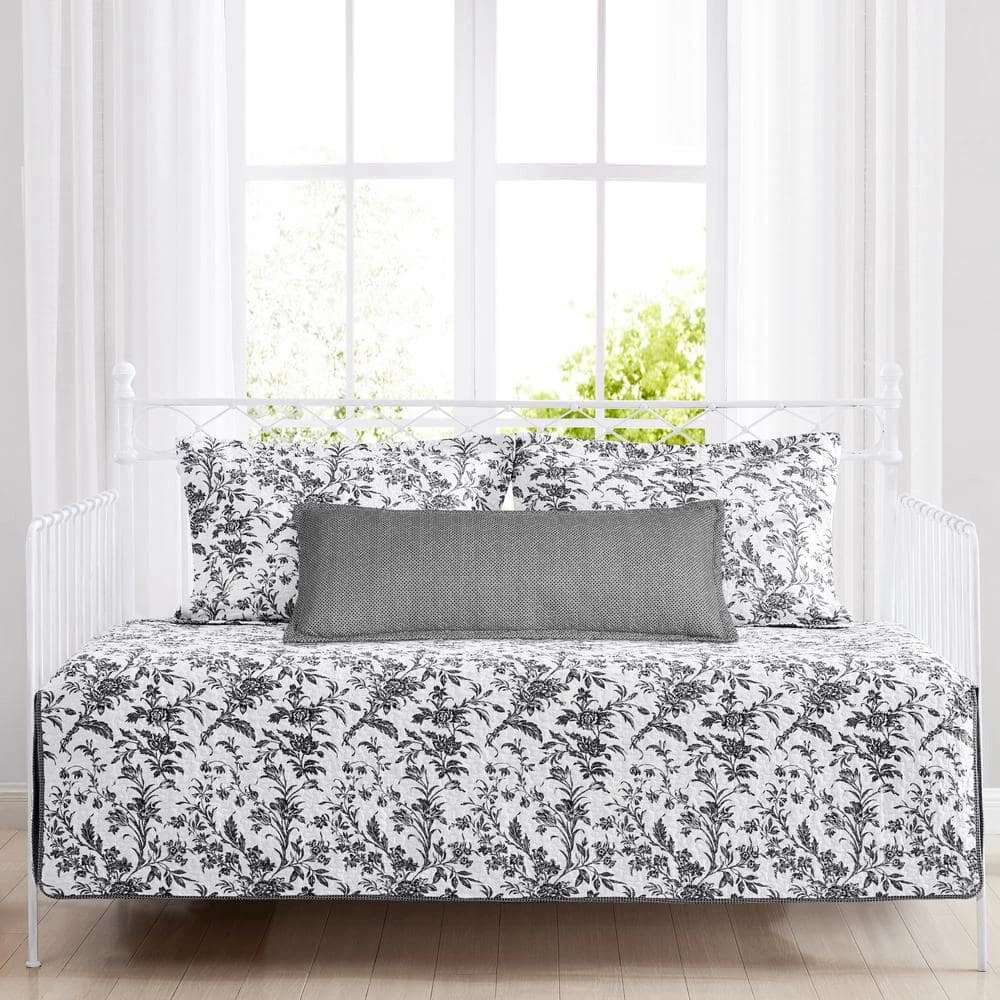 Laura Ashley’s best-selling Amberley quilt, now available in a daybed set. Features a timeless floral toile design in bold black and white. This convenient set is perfect for your guest room or any room – daybed, two shams and decorative pillow cover included. Just add sheets! (Your favorite Laura Ashley sheets are sold separately) pillow insert not included. Daybed face, reverse, shams and pillow cover made from 100% cotton. quilting fill is a blend of 80% cotton 20% polyester for warmth without the added weight. Measurements: twin daybed- 75″L X 39″W, standard shams- 21″L x 27″W, pillow cover- 14″L x 36″W. Machine washable for easy care.