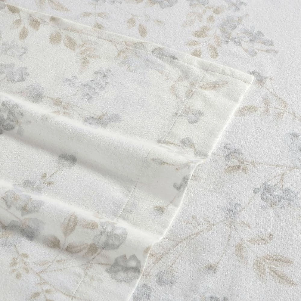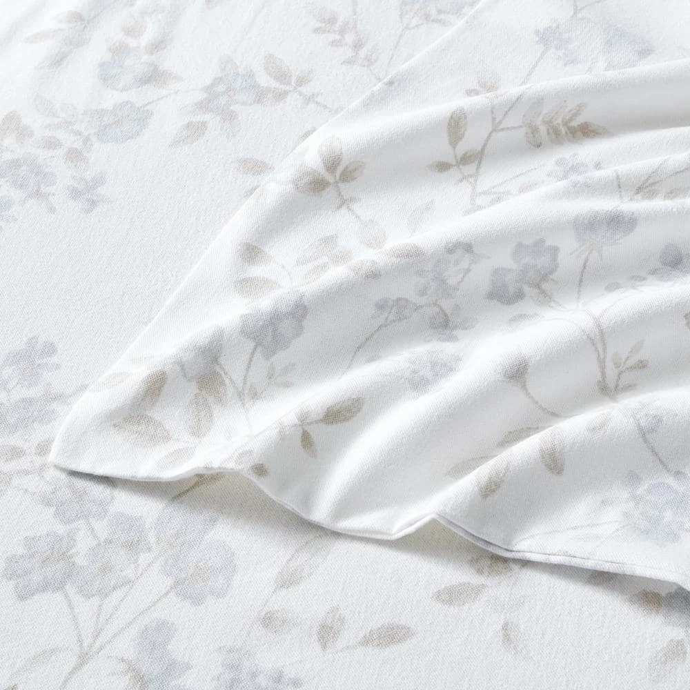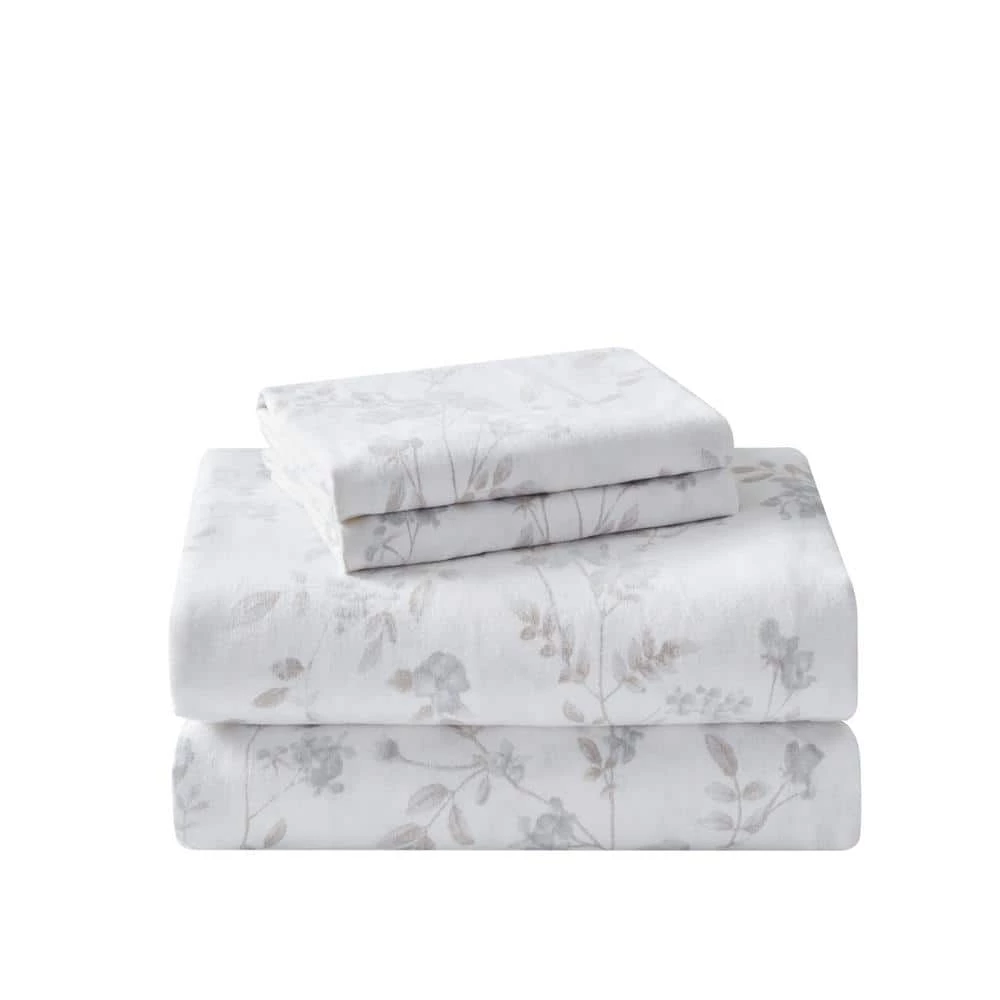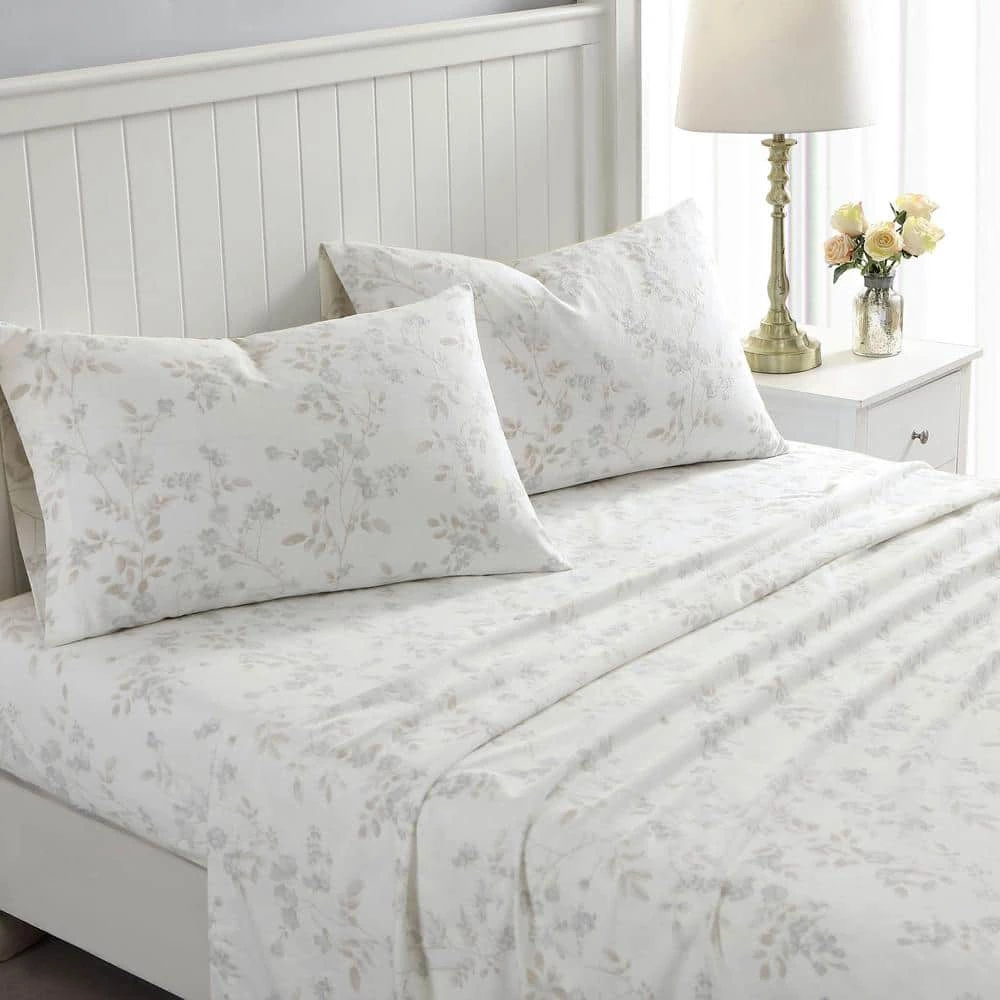 - The Laura Ashley Fawna Flannel Sheet Set features a light grey floral pattern