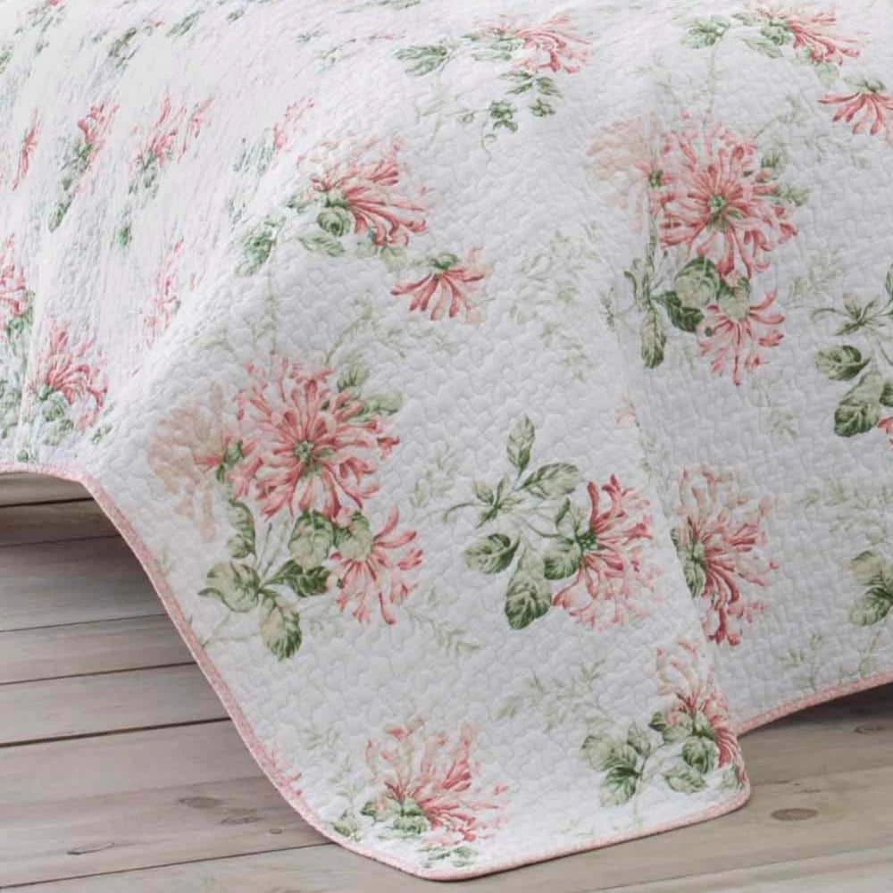 No matter the season, this lovely honeysuckle floral printed quilt set will add springtime cheer to your bedroom. Blush tones mixed with sage greens create a soft and inviting palette on a clean white background. The quilt reverses to a small-scale leaf print in blush and white that also binds the edges of the quilt. A vermicelli quilt stitch adds depth and texture. Prewashed for softness, this 100% cotton quilt set becomes cozier with each wash. Filled with a blend of 80% cotton/20% poly it is light weight yet can be layered for year-round use. Set includes one quilt and two shams for full/queen and king size, one sham for twin size . Machine washable for easy care.