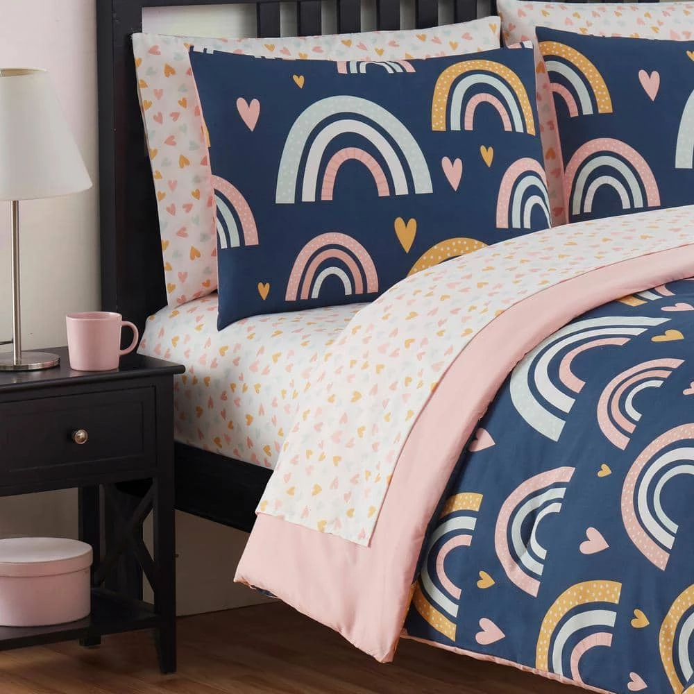 The kute kids Haley Rainbows Comforter and Sheet Set is sure to keep your child dreaming of dancing in a sky of beautiful rainbows. This dreamy comforter features serene rainbows on a baby blue background. Ultra-soft and durable, this set is also machine washable for added convenience. Sweet dreams.