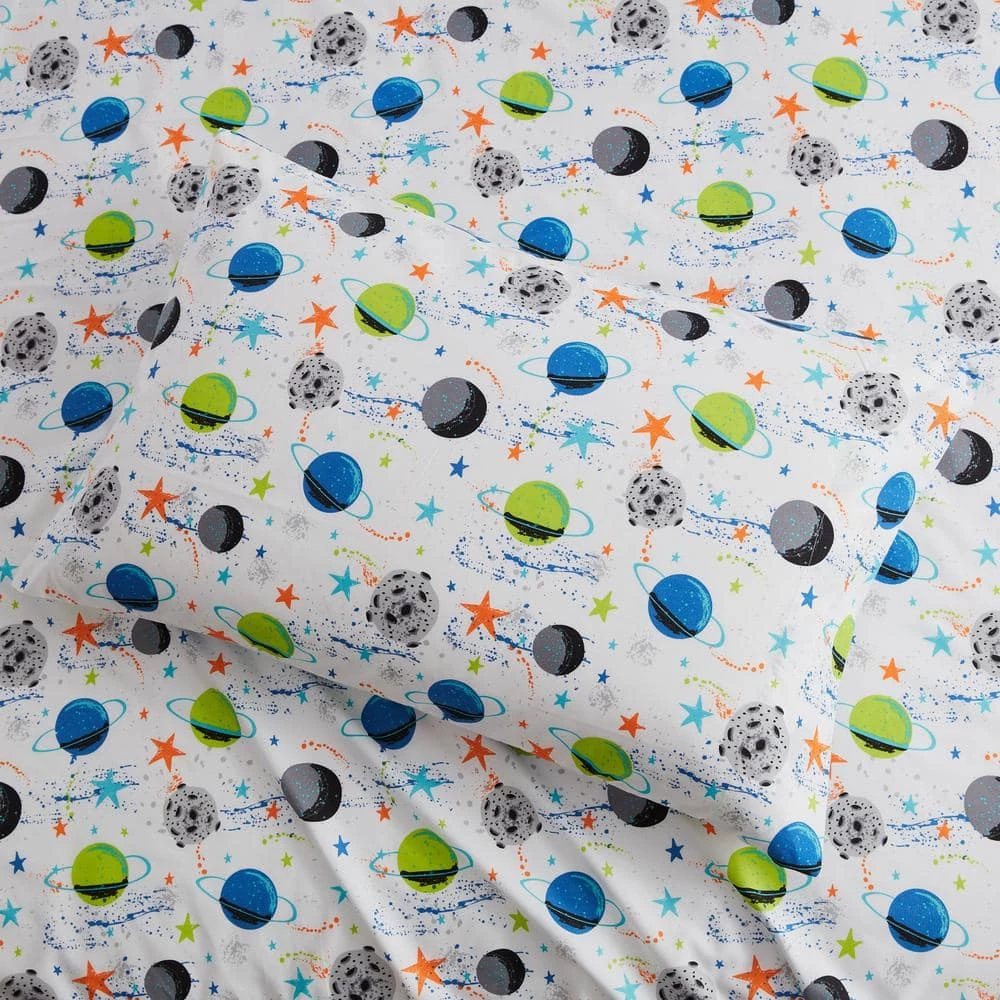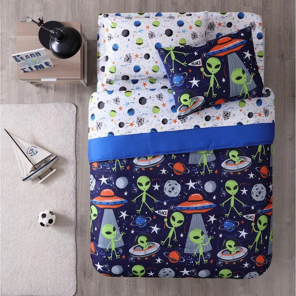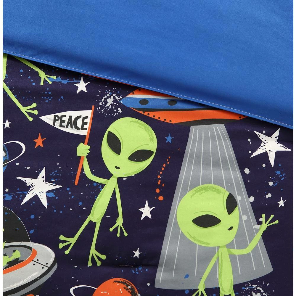 Dream big in the final frontier with the kute kids Alex the Alien 5-Piece Bedding Set. Featuring the friendliest Alien around, and all the planets and stars of his world, this bedding set is sure to create adventurous dreaming. Ultra-soft and durable, this set is also machine washable for added convenience. Next stop, the great unknown. Sweet dreams.