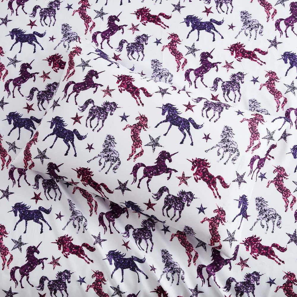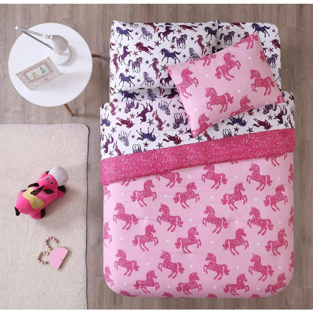 Dazzling glitter and unicorns are the perfect combination in the kute kids Pink Unicorn Sparkle 5-Piece Bedding Set. The unicorns shine bright and shimmer, more radiant than the stars in the night’s sky. Ultra soft and durable, this collection is also machine washable. Sparkle on and sweet dreams. Please note that this set features printed glitter, not actual glitter.