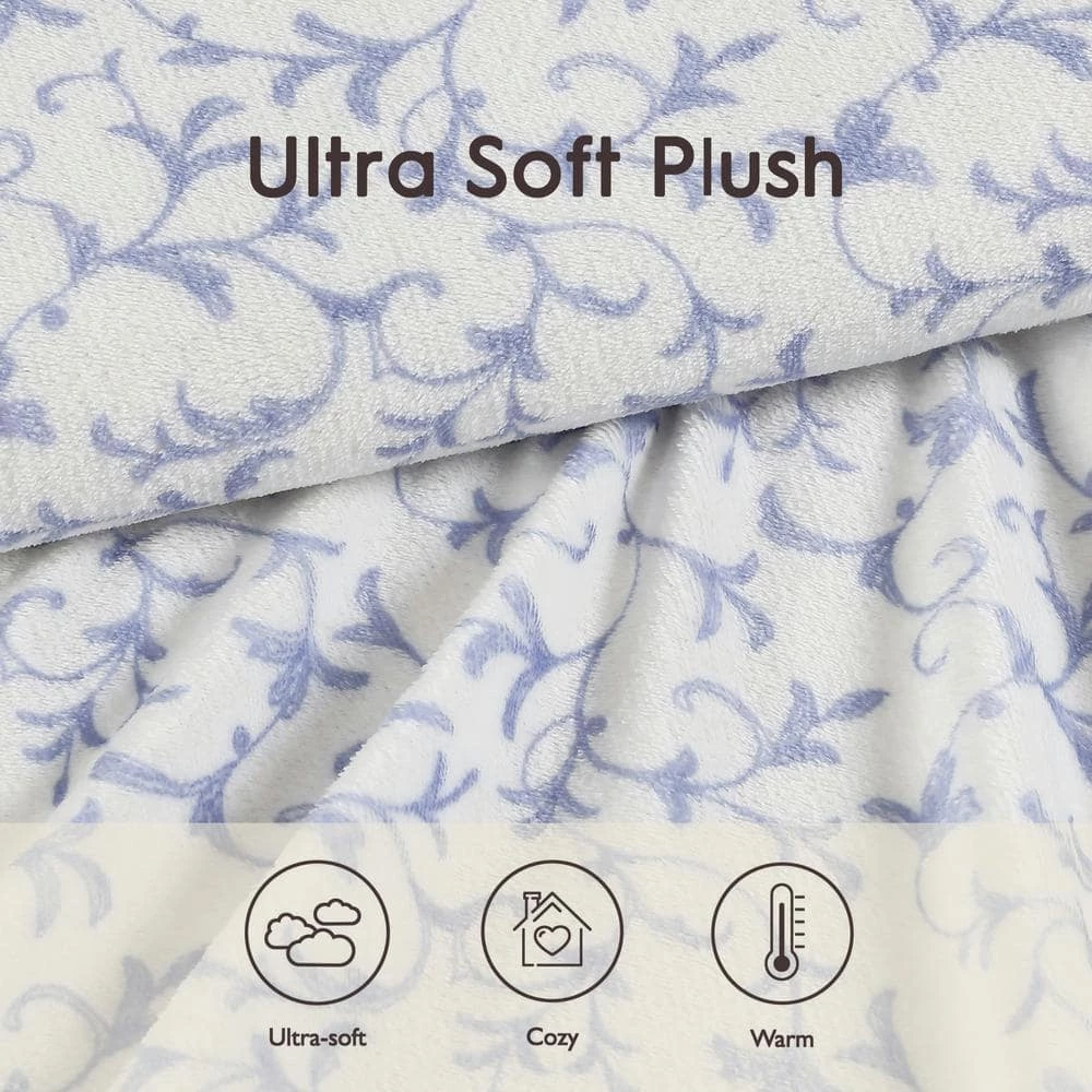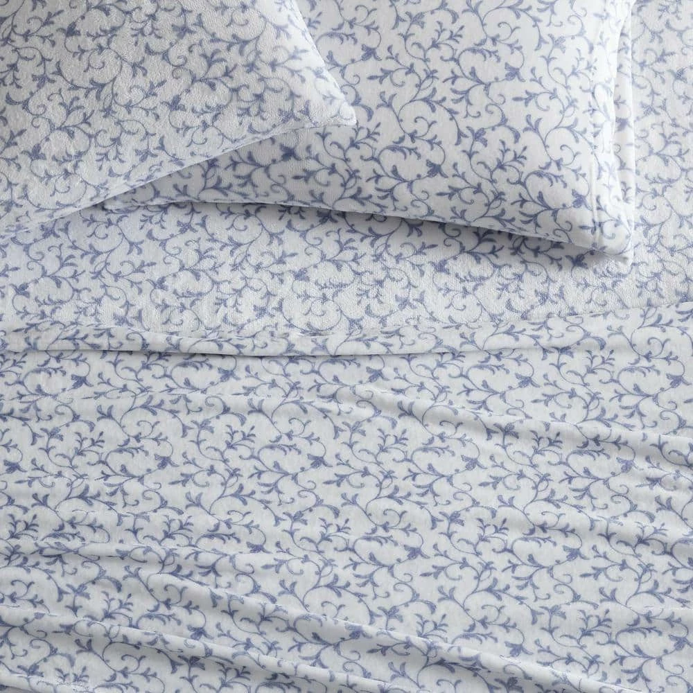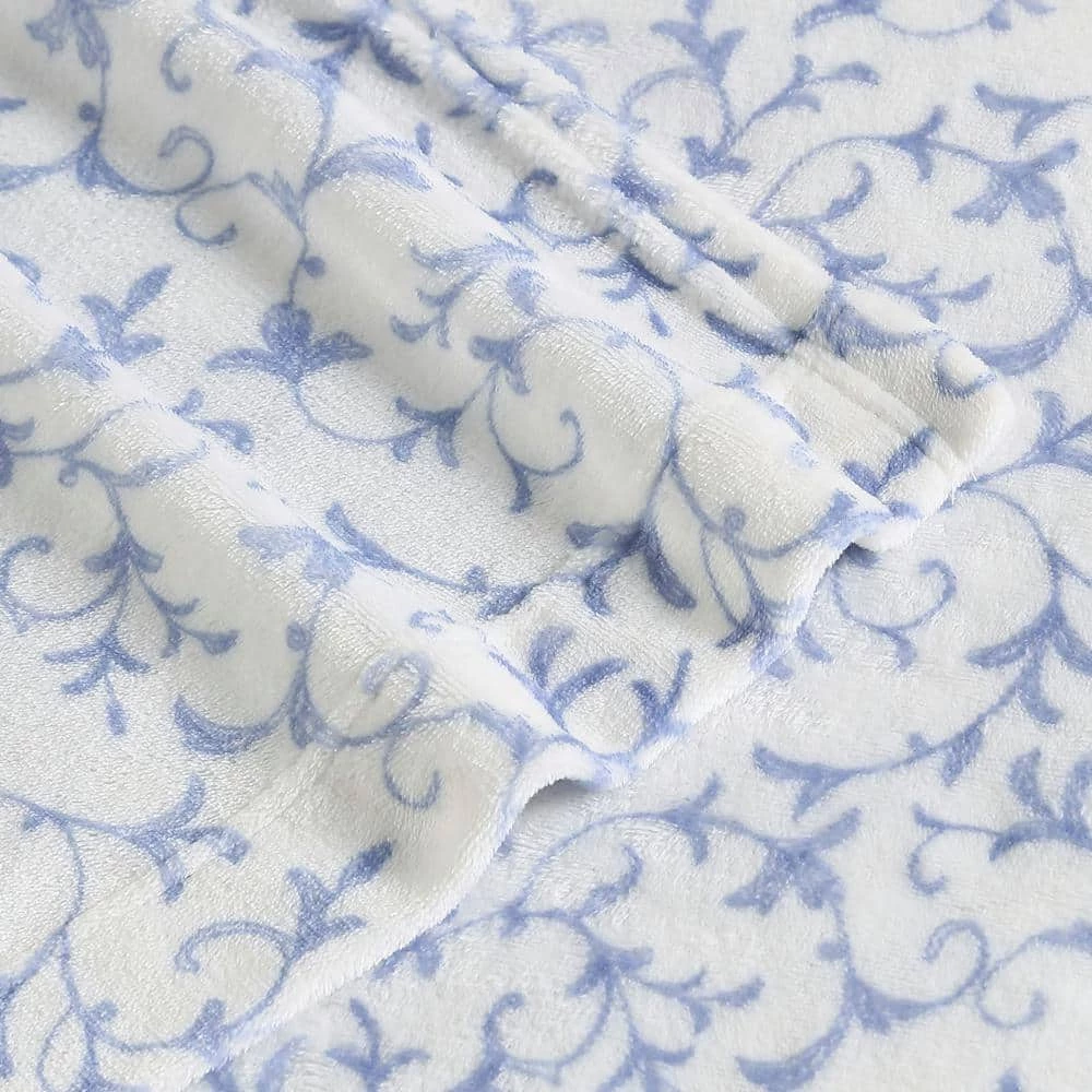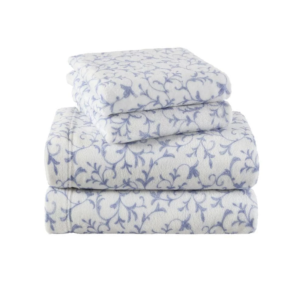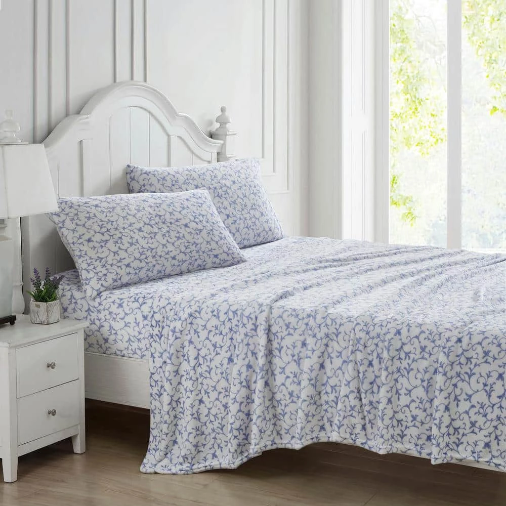 - Laura Ashley plush fleece sheet sets are available in both solid grey and blue as well as a printed periwinkle blue classic scroll design and a delicate grey floral, both prints on white ground