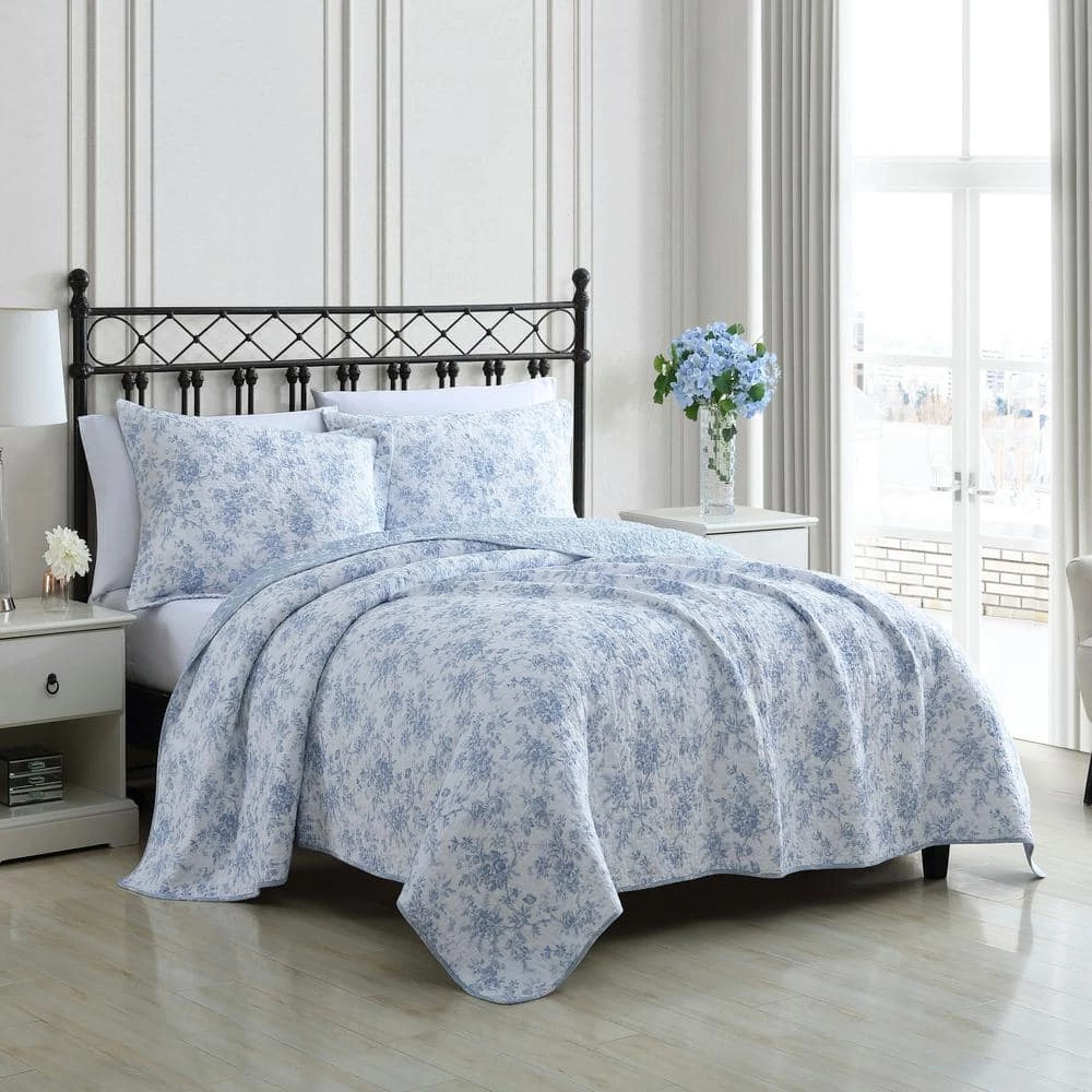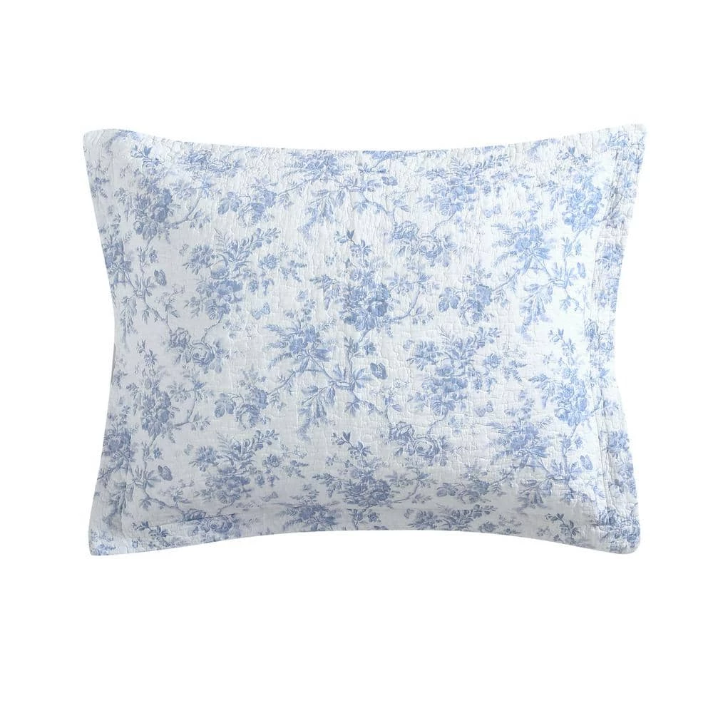 The Laura Ashley walled garden quilt-sham set highlights a refreshing cool blue in a sophisticated floral toile pattern that is printed on crisp white. Reverses to the opposite floral pattern in white on a light blue ground.prewashed for softness, this 100% cotton quilt set becomes cozier with each wash. Filled with a blend of 80% cotton/20% poly it is light weight yet can be layered for year-round use. Set includes one quilt and two shams for full/queen and king size, one sham for twin size . Machine washable for easy care.
