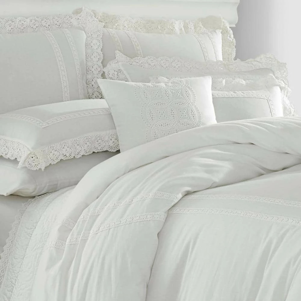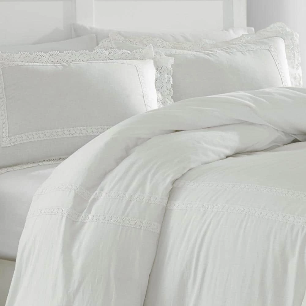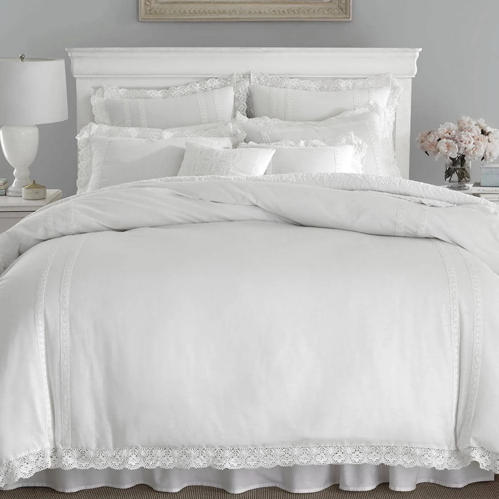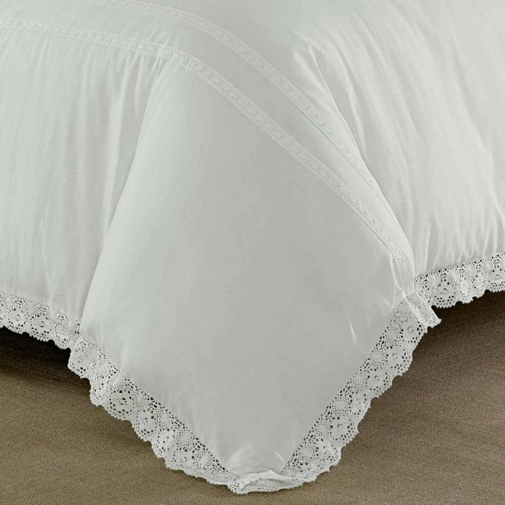 With a nod to the past, this pink on pink or white on white cotton ensemble trimmed with crocheted lace adds romance and modern femininity to your bedroom decor. Classic elements look fresh in this streamlined update and cool, crisp cotton adds welcome comfort. With Annabella, you can create an elegant, restful retreat you will enjoy coming home to. Duvet cover features a button closer and four inner corner ties- duvet cover insert not included. Duvet cover set is machine washable for easy care. Twin Duvet Cover Set includes: One twin duvet cover (66 in. L x 86 in. W) and 1-standard sham (20 in. L x 26 in. W) Full/Queen Duvet Cover Set includes: 1-full/queen duvet cover (92 in. L x 88 in. W) and 2-standard shams (20 in. L x 26 in. W) King Duvet Cover Set includes: One king duvet cover (92 in. L x 106 in. W) and 2-king shams (20 in. L x 36 in. W).