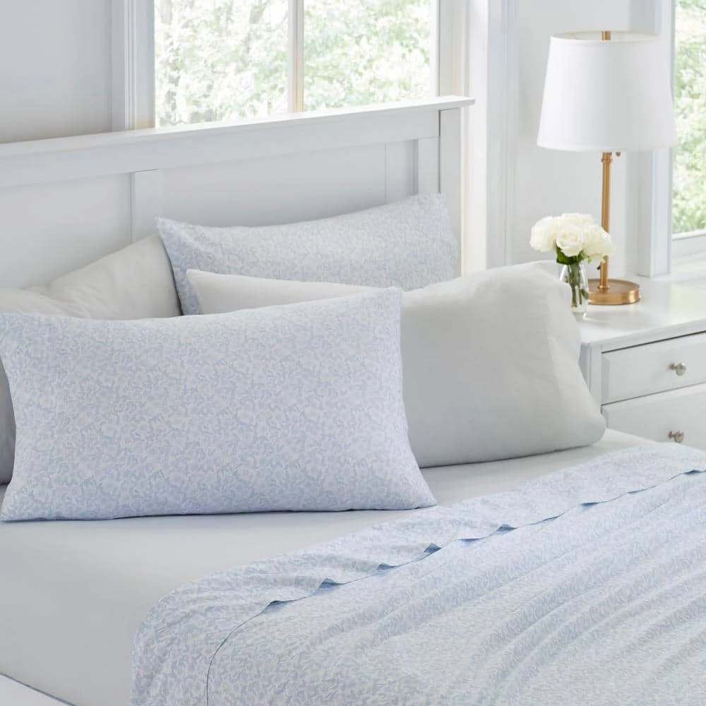 Add gorgeous style to your bedroom decor with the garden-inspired Belle Cotton Sheet Set from Laura Ashley. The sheet set features a signature cottage floral in a subtle palette of light blue on the crisp white ground. Bring fun and unique style to your home with this mixed set which includes extra solid pastel blue pillowcases. Set is constructed with crisp and breathable percale cotton and is machine washable for easy care. The set includes a fully elasticized fitted sheet that prevents slipping from your mattress and ensures a perfect fit. Twin sheet set includes: one flat sheet: (96″L x 66″W), one fitted sheet (75″L x 39″W) and two pillowcases (20″L x 30″W). Full sheet set includes: one flat sheet: (96″L x 81″W), one fitted sheet (75″L x 54″W) and four pillowcases (20″L x 30″W). Queen sheet set includes: one flat sheet: (102″L x 90″W), one fitted sheet (80″L x 60″W) and four pillowcases (20″L x 30″W). King sheet set includes: one flat sheet: (102″L x 108″W), one fitted sheet (80″L x 78″W) and four pillowcases (20″L x 40″W).
