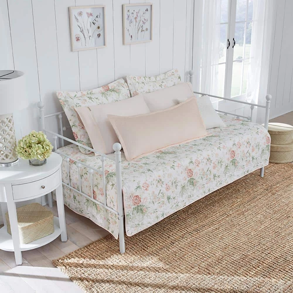 Laura Ashley’s iconic Breezy Floral quilt, now available in a daybed set. Features a country cottage floral in soft pinks and greens. This convenient set is perfect for your guest room or kids room – daybed, two shams and decorative pillow cover included. Just add sheets! (Your favorite Laura Ashley sheets are sold separately) pillow insert not included. Daybed face, reverse, shams and pillow cover made from 100% cotton. Quilting fill is a blend of 80% cotton 20% polyester for warmth without the added weight. Measurements: twin daybed- 75″L X 39″W, standard shams- 21″L x 27″W, pillow cover- 14″L x 36″W. Machine washable for easy care.