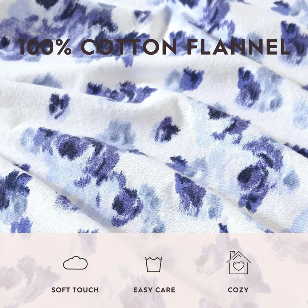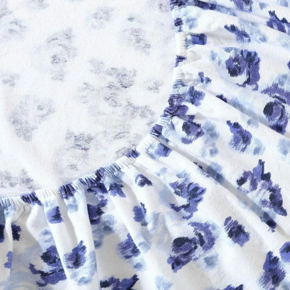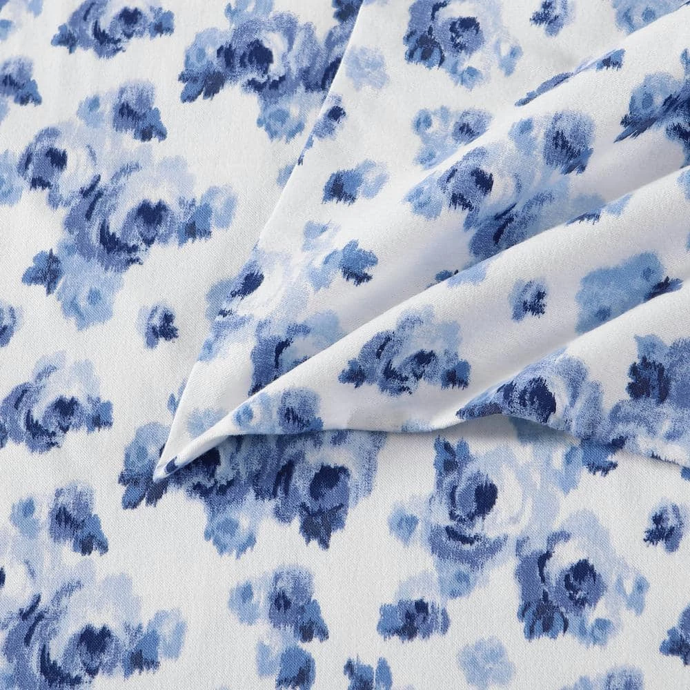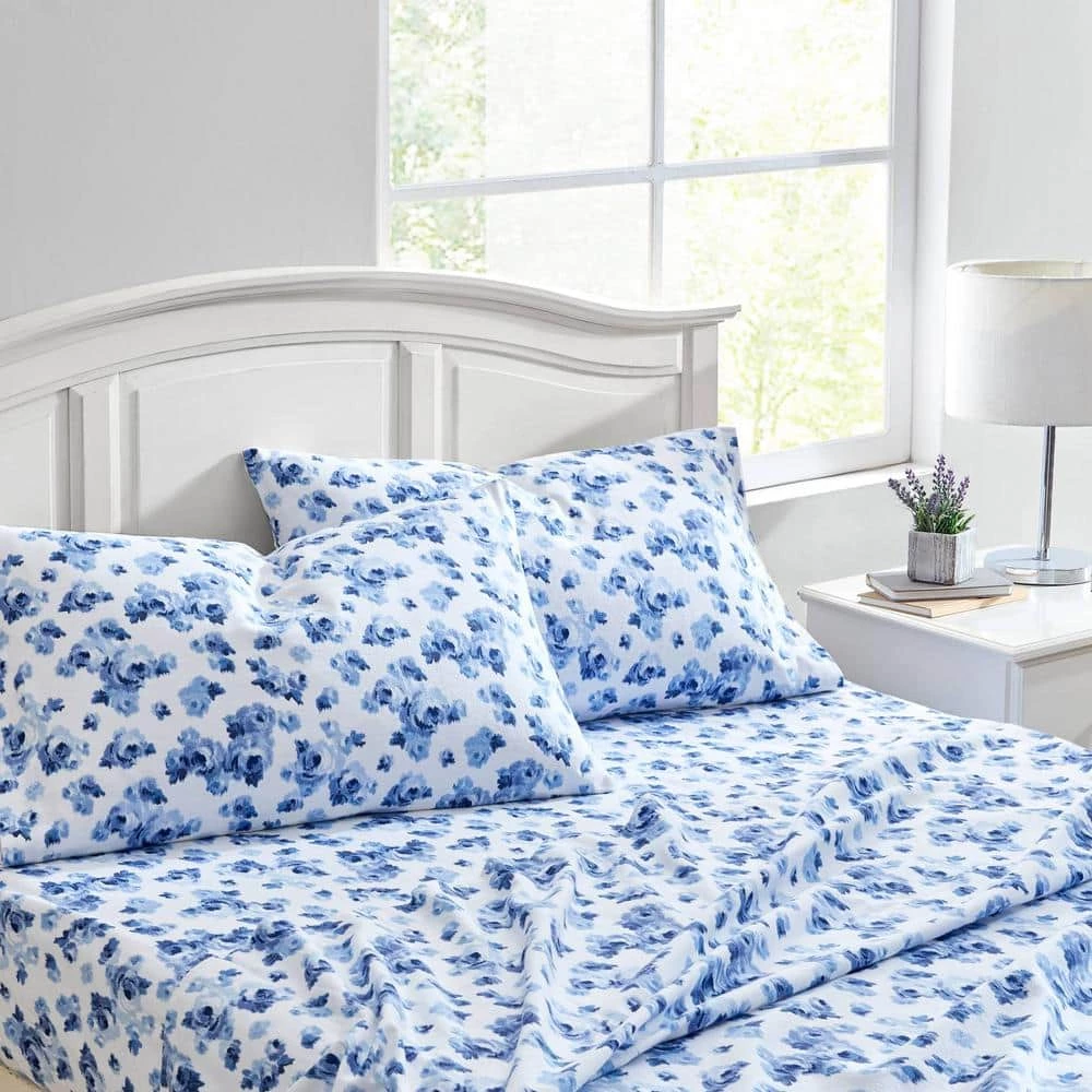- The Laura Ashley Emelisa Flannel Sheet Set highlights classic English roses in watery shades of light to deep blue on a white ground