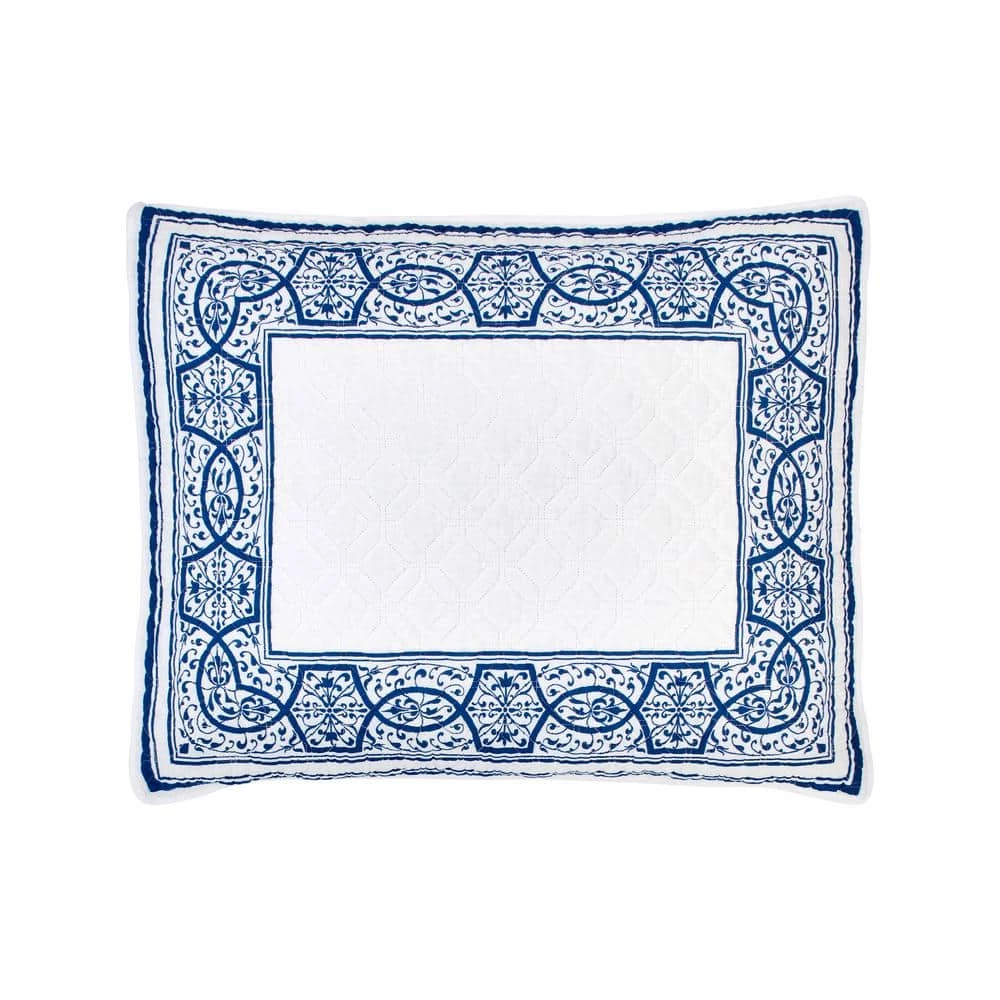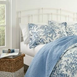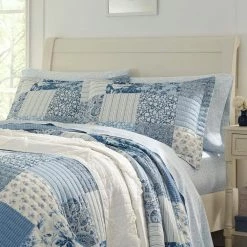 Make an elegant statement with the stunning Vivian quilt and shams from Laura Ashley. A gorgeous deep blue tile print borders the clean white quilt, enhanced by a circular geometric quilt stitch. reverses to solid white. This eye-catching design is a timelesss addition to any bedroom. Prewashed for softness, this 100% cotton quilt set becomes cozier with each wash. Filled with a blend of 80% cotton/20% poly it is light weight yet can be layered for year-round use. Quilt and shams sold separately. Machine washable for easy care.