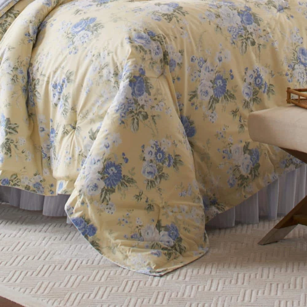 Update your bedroom decor with the Maybelle cotton comforter set from Laura Ashley. Bringing a breath of spring in any season, the comforter set features white blossoms with bluebell accents and fresh spring green leaves on the soft yellow ground. This washed cotton set features a solid ruffled bed skirt, which adds the finishing touch to your bedding ensemble. Comforter features a polyester fill and the set is machine washable for easy care. Twin comforter set includes: one comforter (86″l x 63″w), one bed skirt (75″l x 39″w) and one standard sham (21″l x 27″w). Full comforter set includes: one comforter (86″l x 82″w), one bed skirt (75″l x 54″w) and two standard shams (21″l x 27″w). Queen comforter set includes: one comforter (92″l x 88″w), one bed skirt (80″l x 60″w) and two standard shams (21″l x 27″w). King comforter set includes: one comforter (92″l x 106″w), one bed skirt (80″l x 78″w) and two king shams (21″l x 37″w).