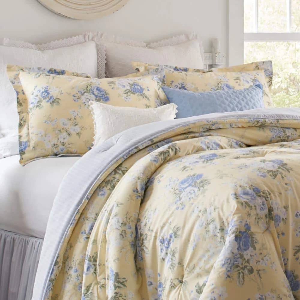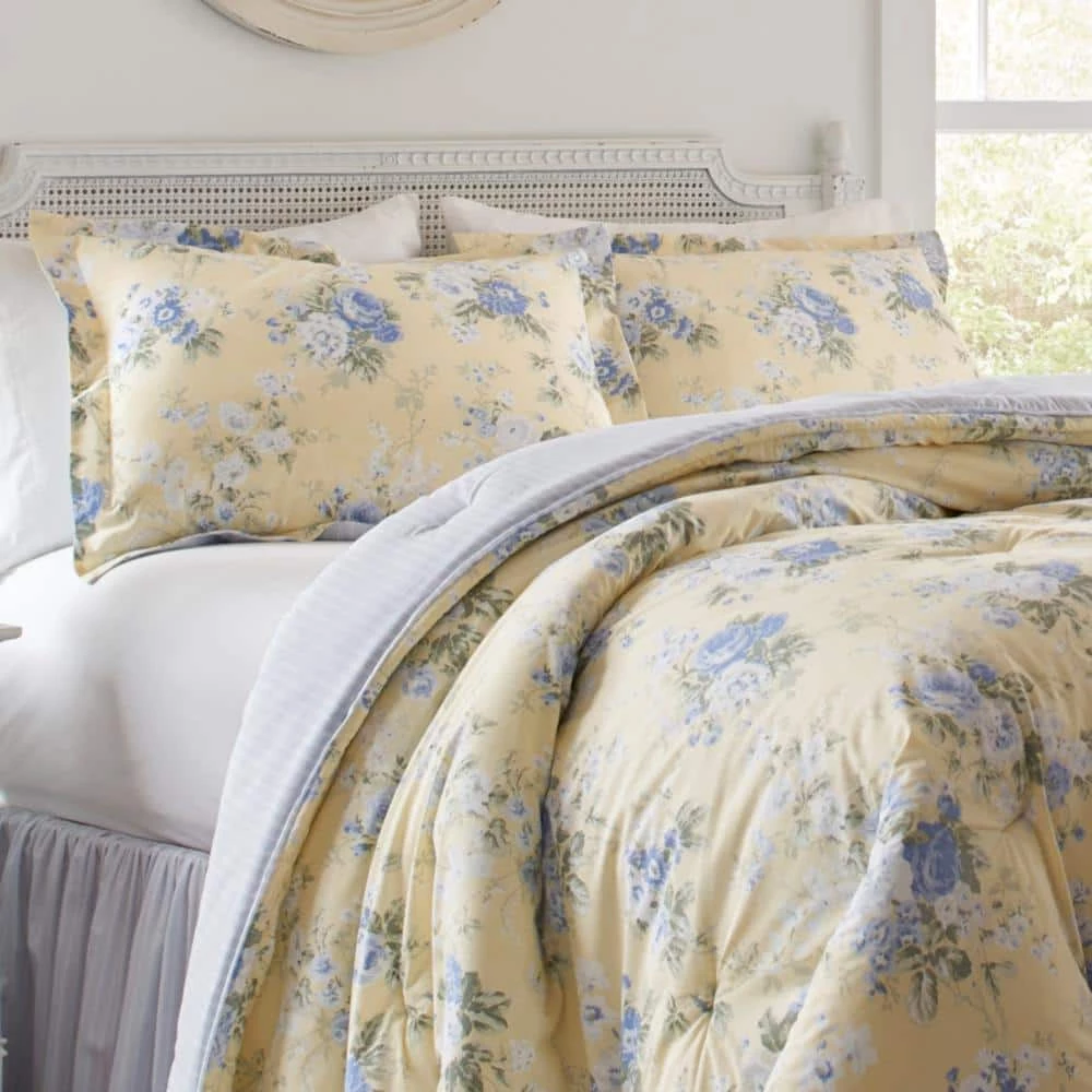 - Garden inspiration brings natural beauty to any space, making Laura Ashley’s floral designs a perfect decorating choice. A pleasing palette of yellow blossoms with bluebell accents and fresh spring green leaves make this soft washed cotton set a breath of