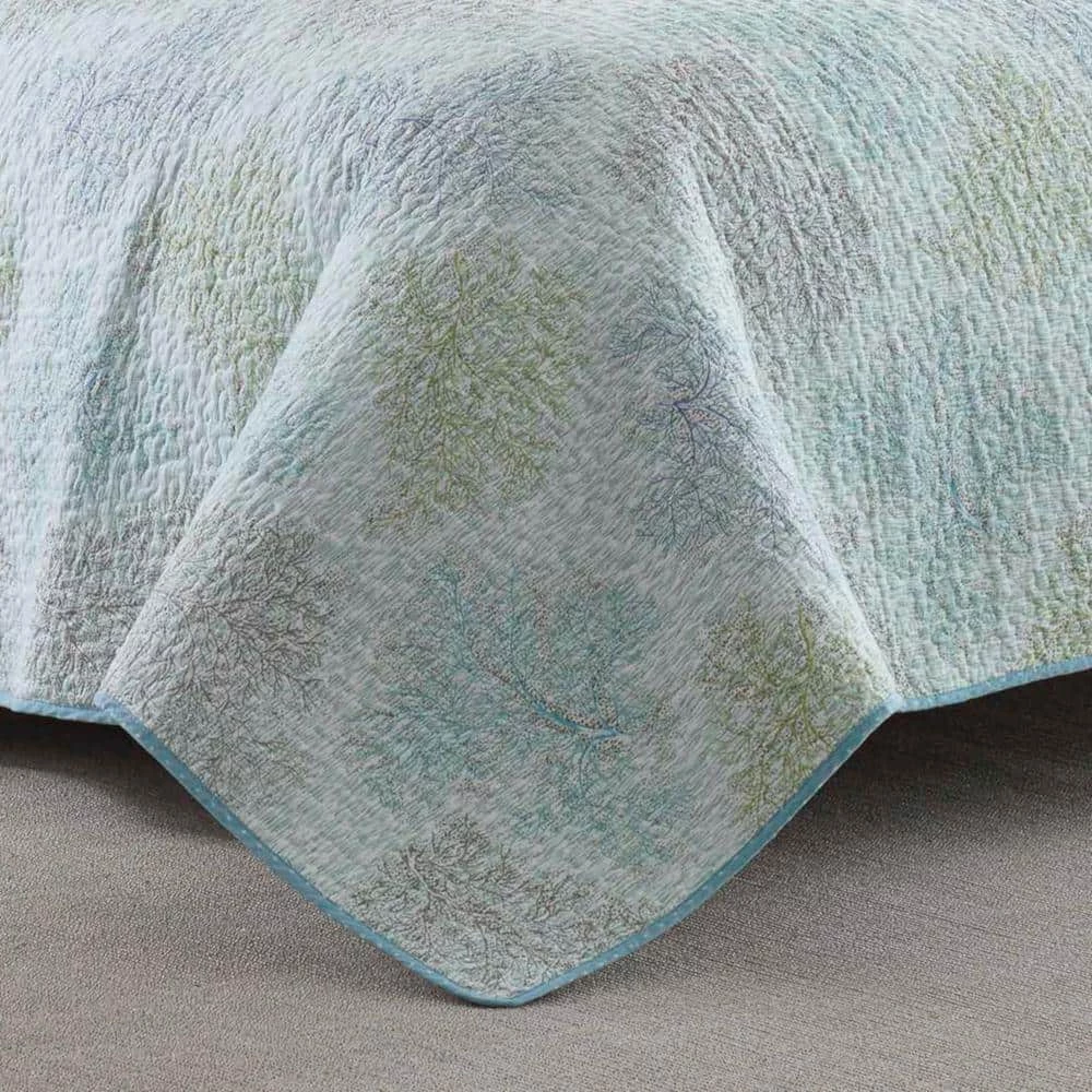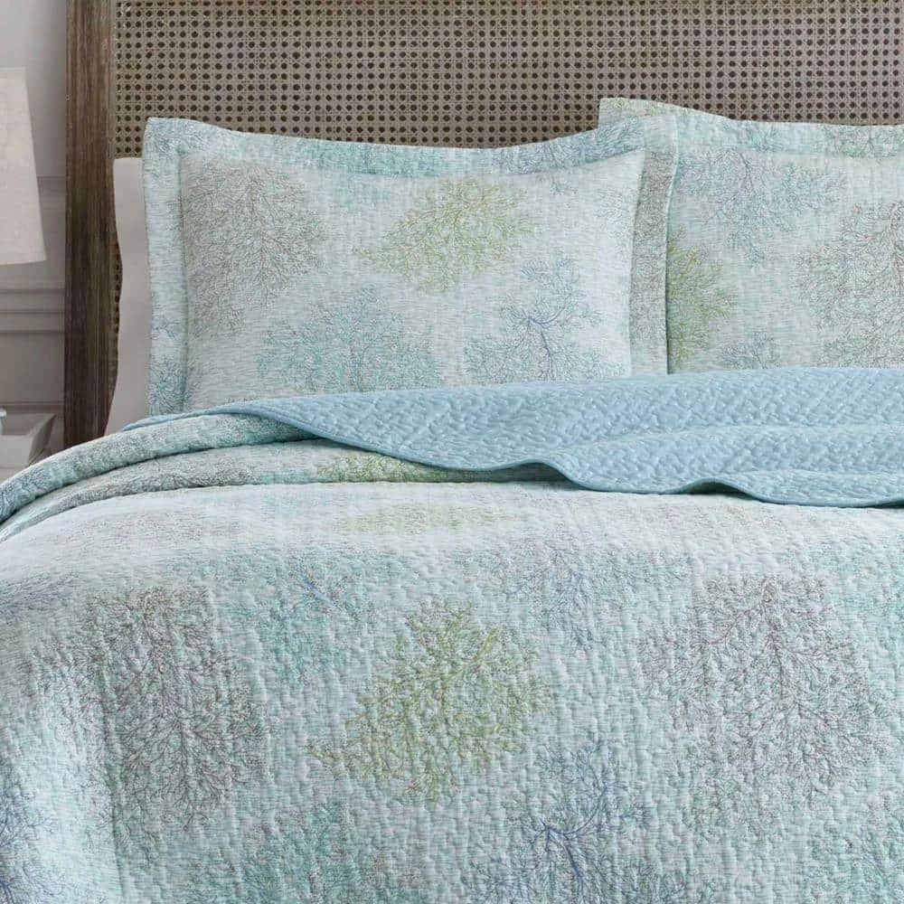 Delicate seaweed branches floating on a watery background bring the beauty of an underwater garden to your bedroom in the saltwater quilt set. Turquoise blue, green and brown accents on a crisp white ground with subtle aqua stripes are cool and serene for a tranquil night sleep. The quilt reverses to a crisp white dot on bright turquoise. Prewashed for softness, this 100% cotton quilt set becomes cozier with each wash. Filled with a blend of 80% cotton/20% poly it is light weight yet can be layered for year-round use. Set includes one quilt and two shams for full/queen and king size, one sham for twin size . Machine washable for easy care.