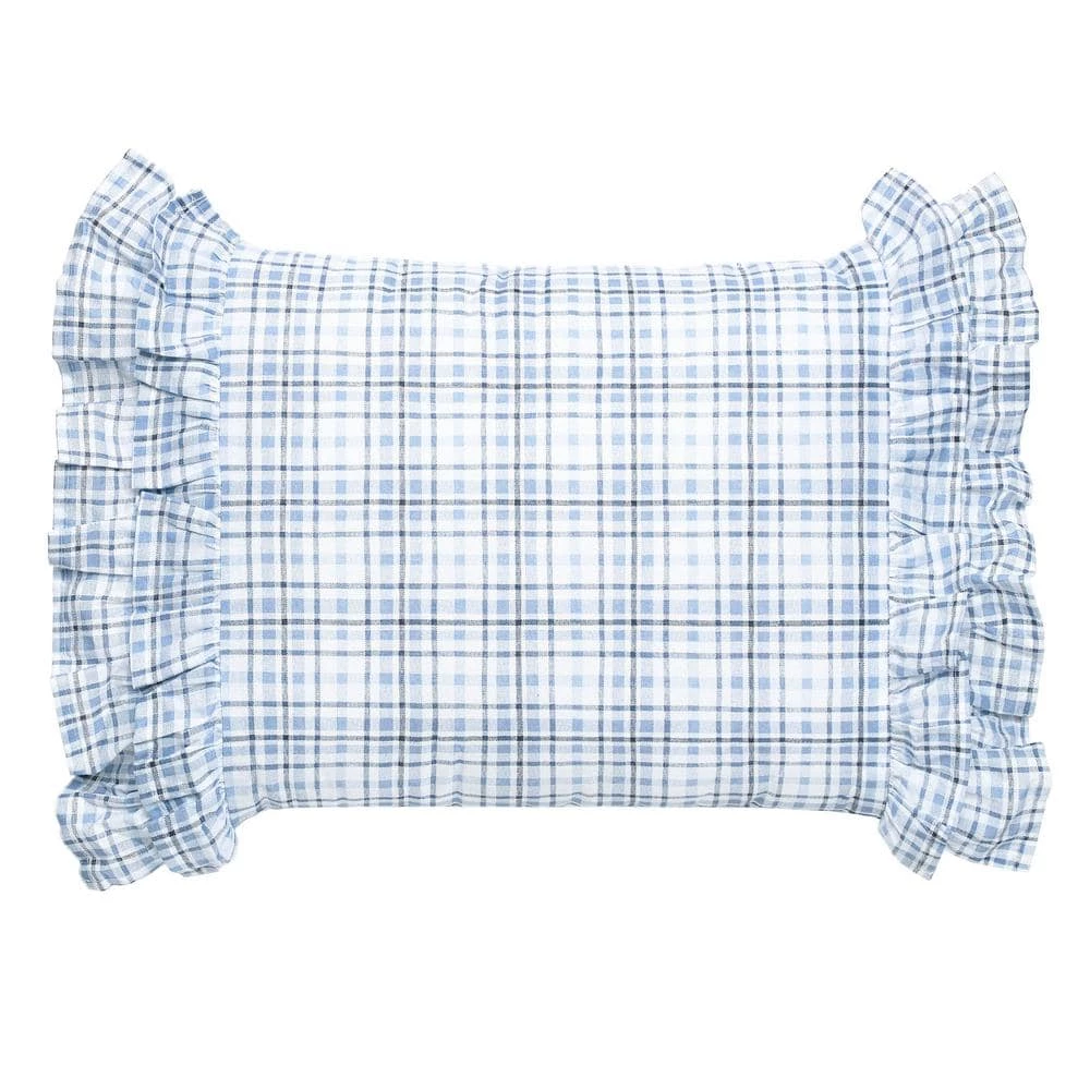 A sunny buttercup yellow background is the perfect showcase for these romantic delft blue roses straight from an English country garden. A pale damask shadow effect in the background adds additional depth and interest to this lovely print. The blue and white plaid reverse appears on the European shams and a ruffled accent pillow as well as trimming a second floral pillow adding a final note of country charm to complete the ensemble.