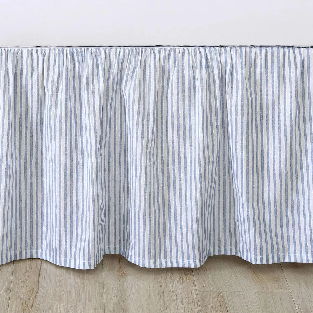The LA Classics Ticking Stripe Ruffled Bedskirt from Laura Ashley is the perfect finishing touch for any bedroom decor. Constructed with quality cotton, this ruffled bedskirt features a blue pinstripe design, with a luxurious texture and lasting durability. Great for concealing bedposts and items stored under your bed, this stylish bedskirt is the perfect choice. Bedskirt is machine washable for easy care. Twin Bedskirt- 75 in. L x 39 in. W , Full Bedskirt- 75 in. L x 54 in. W , Queen Bedskirt- 80 in. L x 60 in. W , King Bedskirt- 80 in. L x 78 in. W .