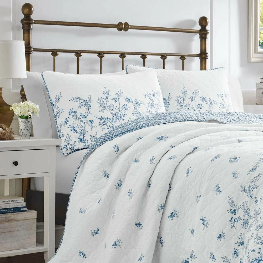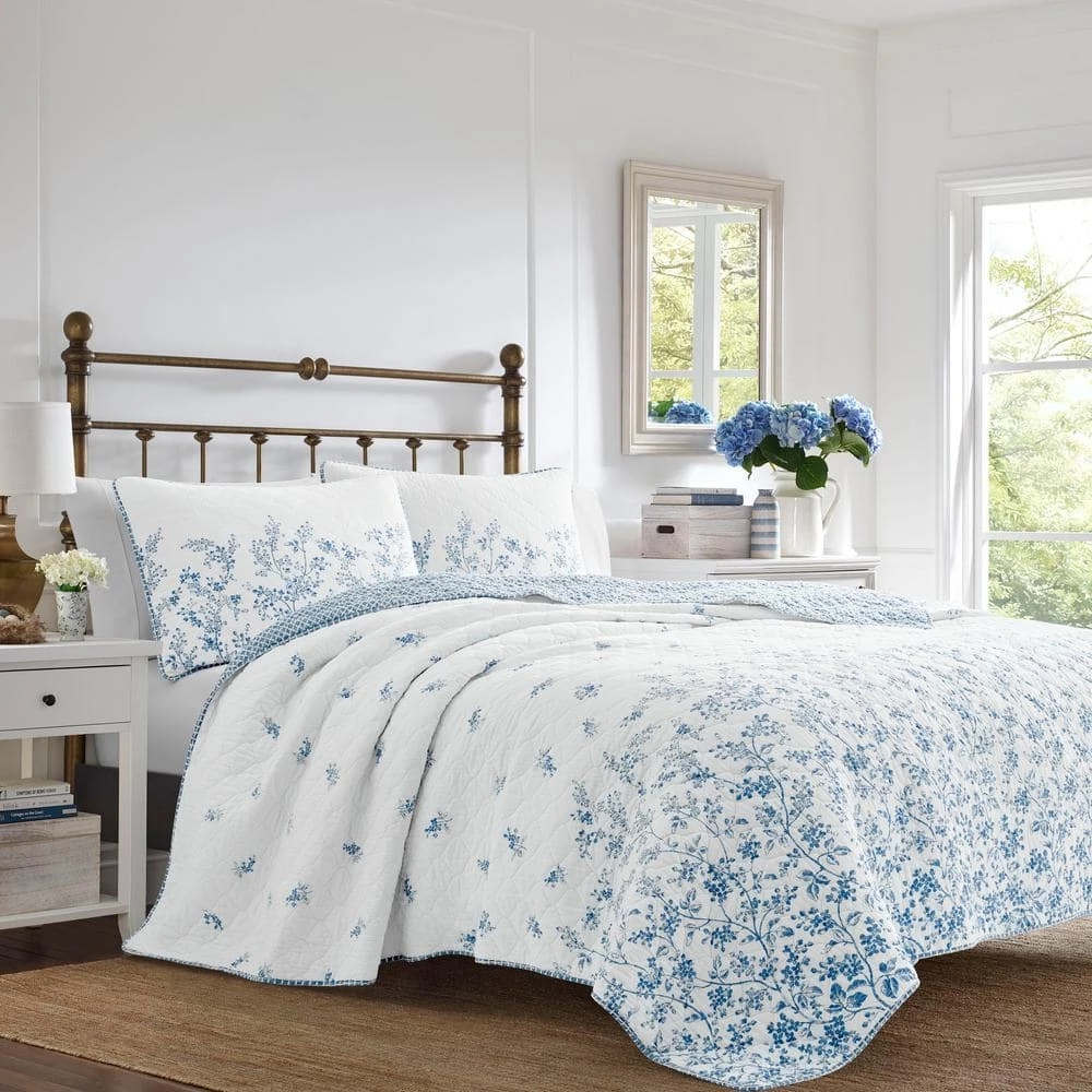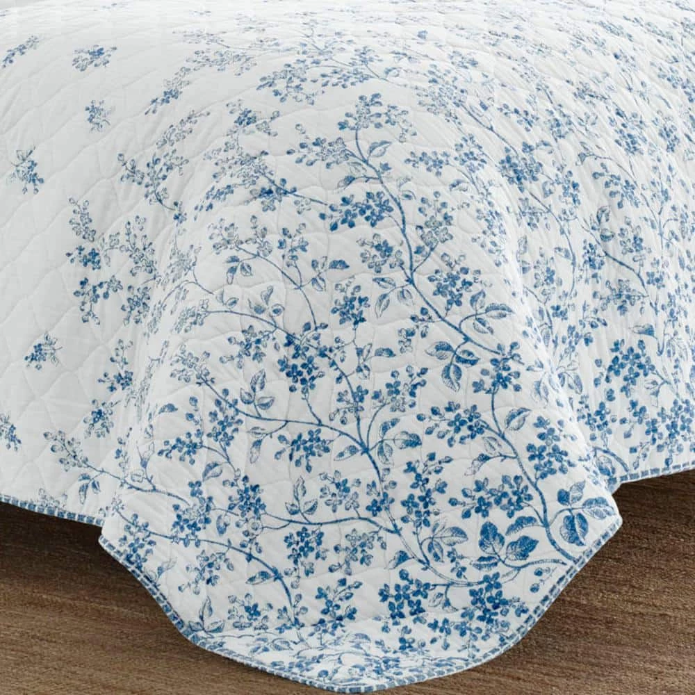 The charming Laura Ashley flora quilt set boasts a delicate cascading blue floral pattern on a white ground. The flowers are densely printed at the bottom of the quilt and slowly scatter away from one another towards the top of the quilt. this gorgeous quilt reverses to a blue and white diamond pattern. Prewashed for softness, this 100% cotton quilt set becomes cozier with each wash. Filled with a blend of 80% cotton/20% poly it is light weight yet can be layered for year-round use. Set includes one quilt and two shams for full/queen and king size, one sham for twin size. Machine washable for easy care.