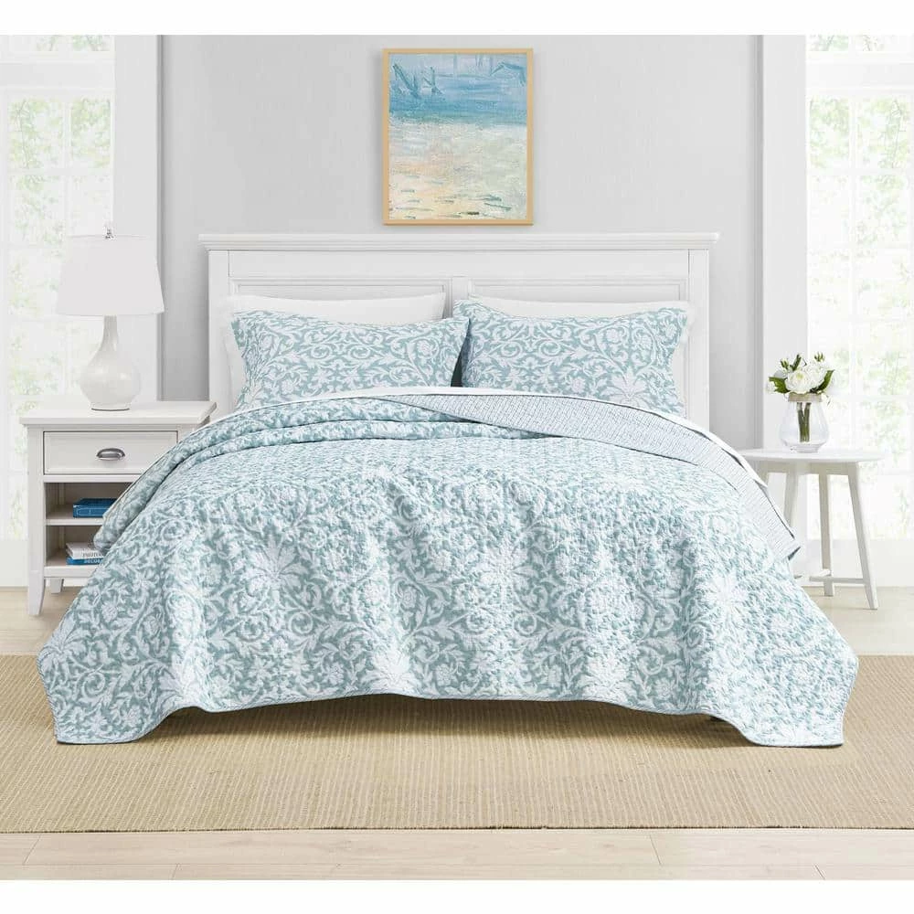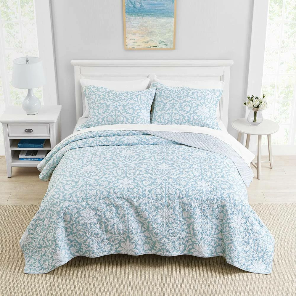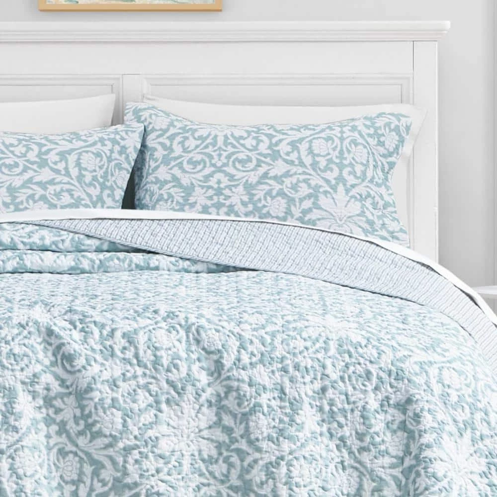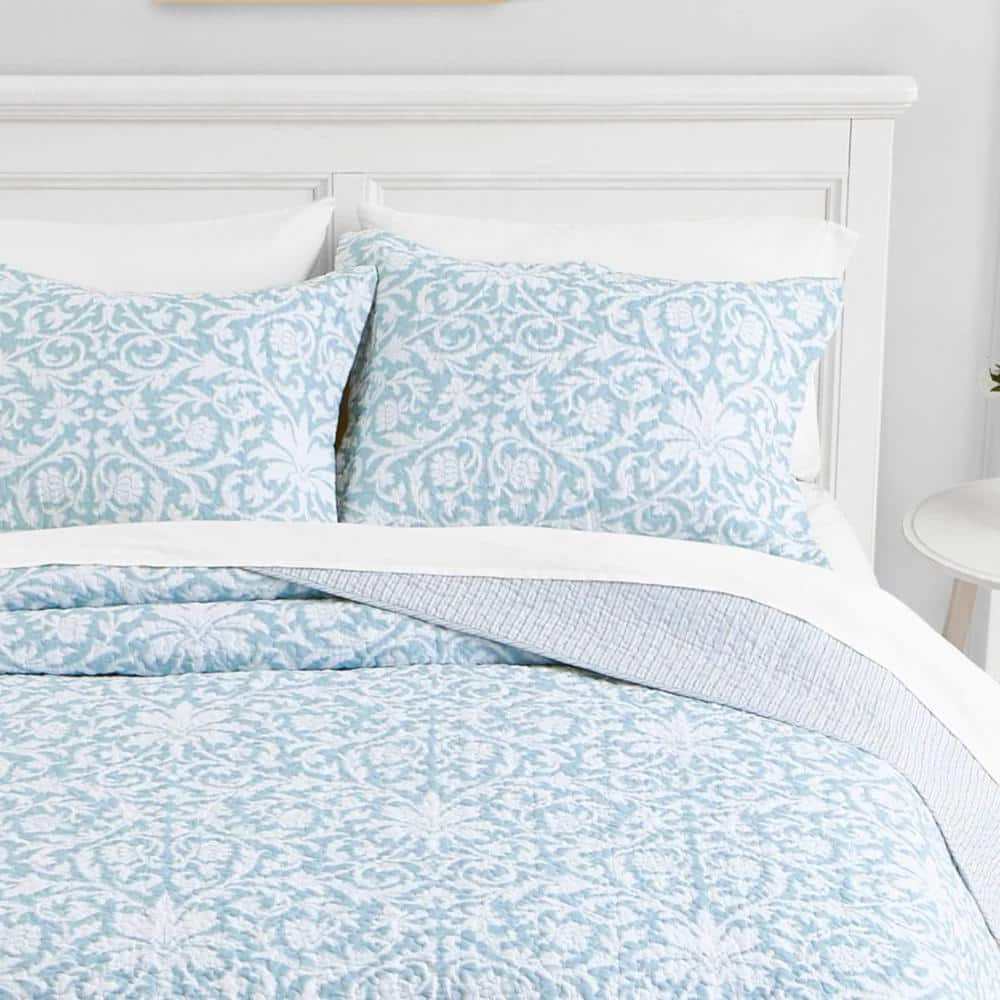 Cool and inviting, Laura Ashley’s mia washed cotton quilt set offers relaxed elegance that is equally at home in a traditional master bedroom or a country cottage. A classic scrollwork design in white on a clear aqua ground is featured on the quilt face and shams, while a delicate wallpaper stripe on the quilt reverse adds a subtle finishing touch. Prewashed for softness, this 100% cotton quilt set becomes cozier with each wash. Filled with a blend of 80% cotton/20% poly it is light weight yet can be layered for year-round use. Set includes one quilt and two shams for full/queen and king size, one sham for twin size . Machine washable for easy care.