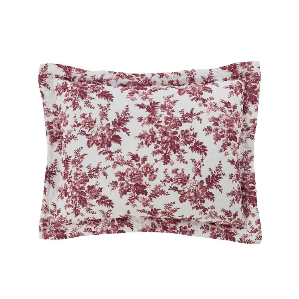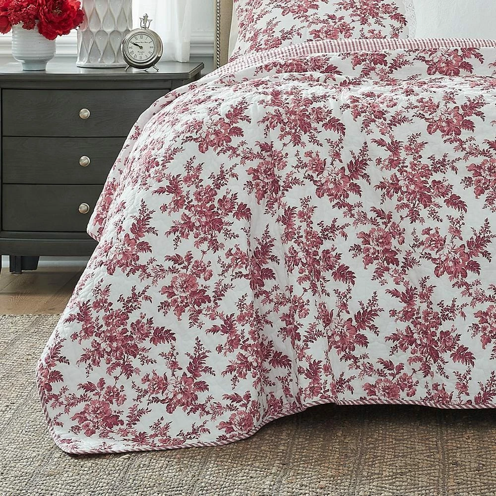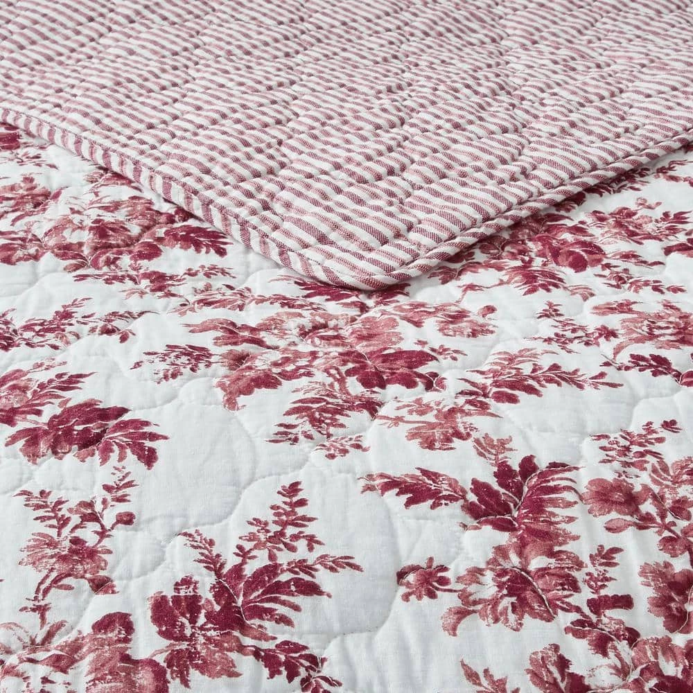 Laura Ashley Annalise quilt is an elegant yet casual floral toile with shirting stripe accents. Updated in a palette of deep reds and white, this classic pairing will transform your bedroom into a relaxing country house retreat. The slightly distressed floral pattern and the textural shirting stripe reverse add depth and richness to this simple design. 100% cotton, prewashed for softness becomes cozier with each wash. Filled with a blend of 80% cotton/20% poly it is light weight yet can be layered for year-round use. Set includes one quilt and two shams for full/queen and king size, one sham for twin size. Machine washable for easy care