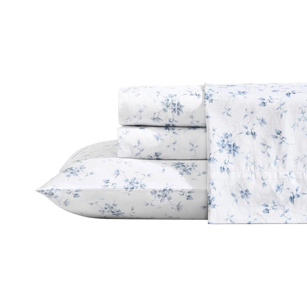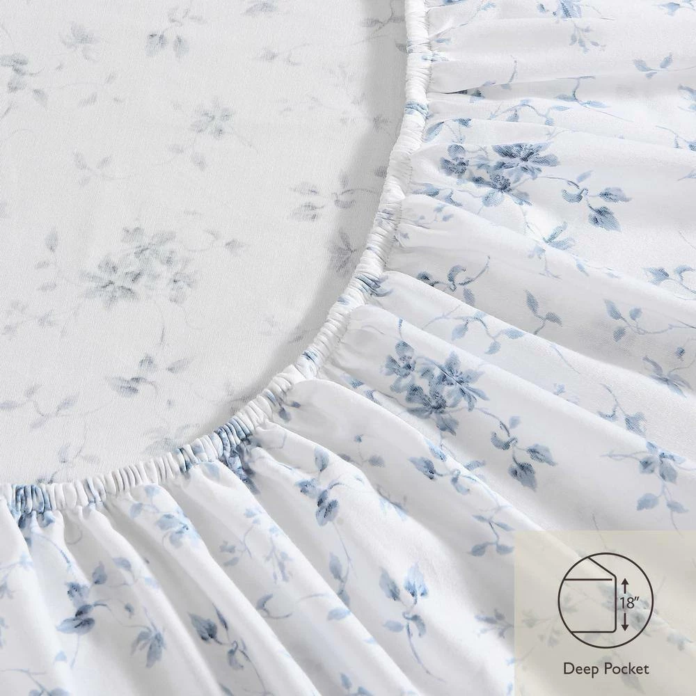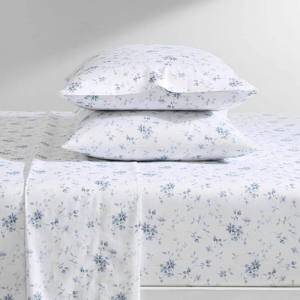 - Laura Ashley garden muse cotton sateen sheet set is soft white with a scattered blue tea rose print