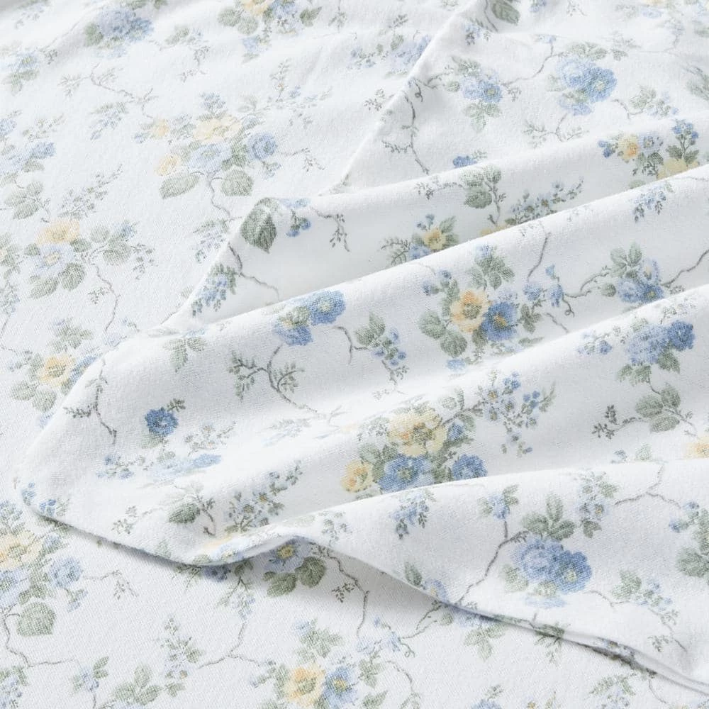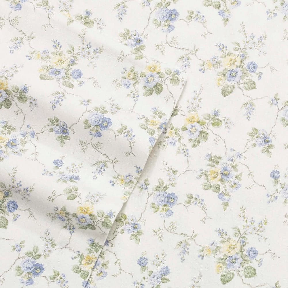 - The Laura Ashley Le Fleur Flannel Sheet Set features a petite floral print in a fresh blue and yellow on white accented with sage green