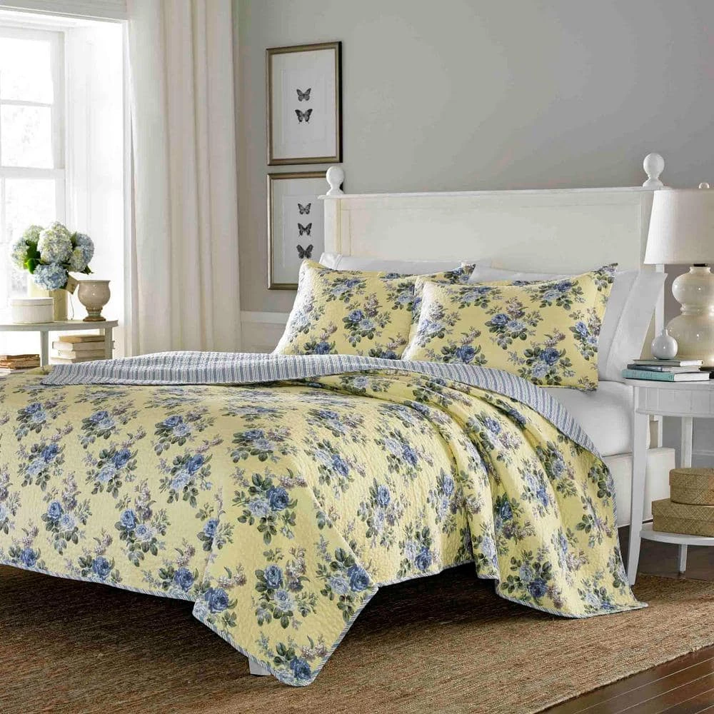 The Laura Ashley linley quilt set will brighten your room with cheerfulness and light. Blue floral bouquets stand out against a pale yellow background. A blue shirting stripe on the reverse side adds a tailored touch. Prewashed for softness, this 100% cotton quilt set becomes cozier with each wash. Filled with a blend of 80% cotton/20% poly it is light weight yet can be layered for year-round use. Set includes one quilt and two shams for full/queen and king size, one sham for twin size . Machine washable for easy care.