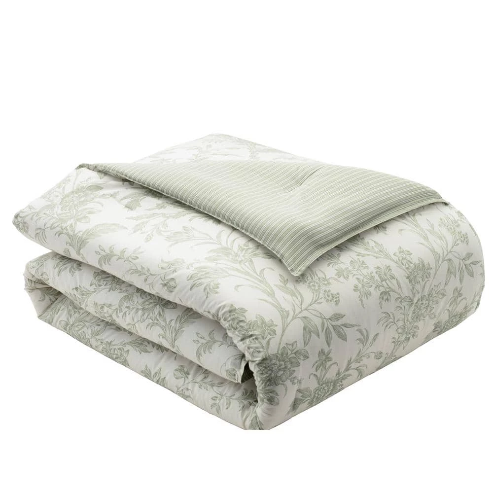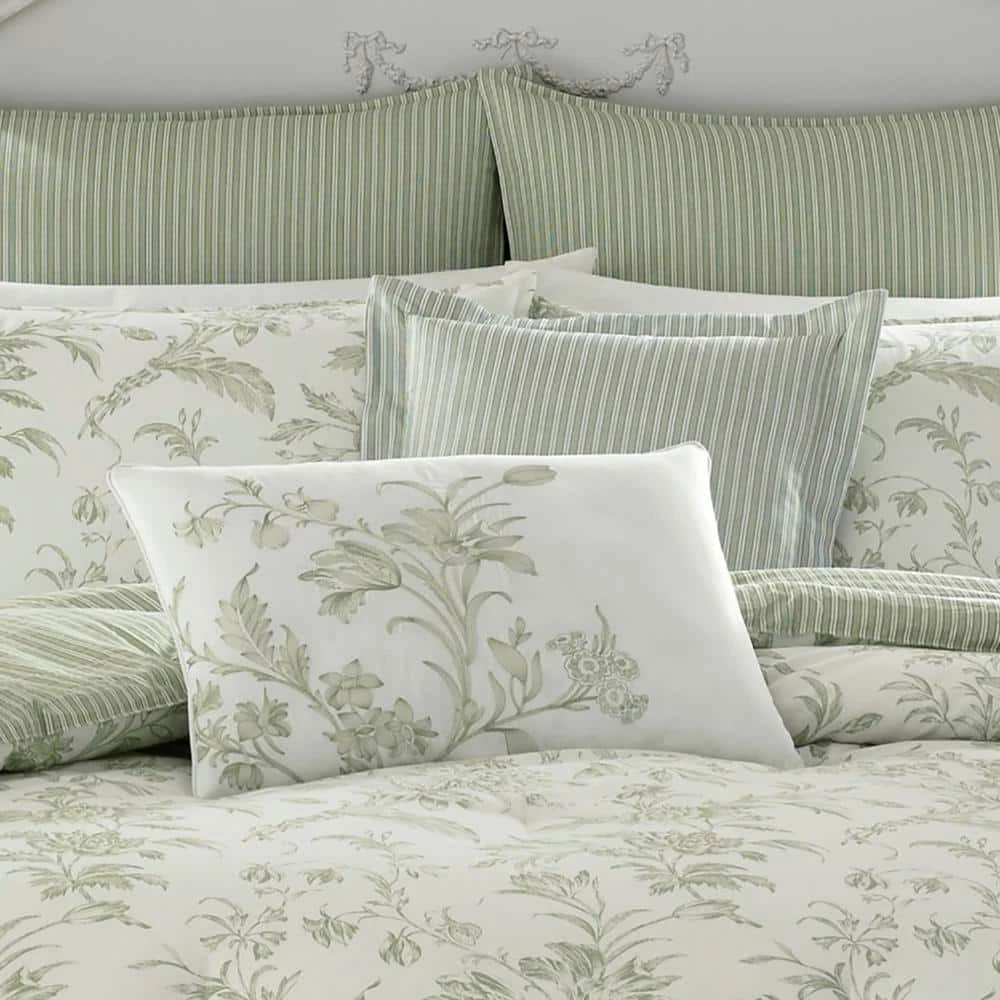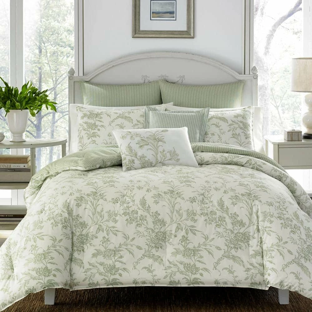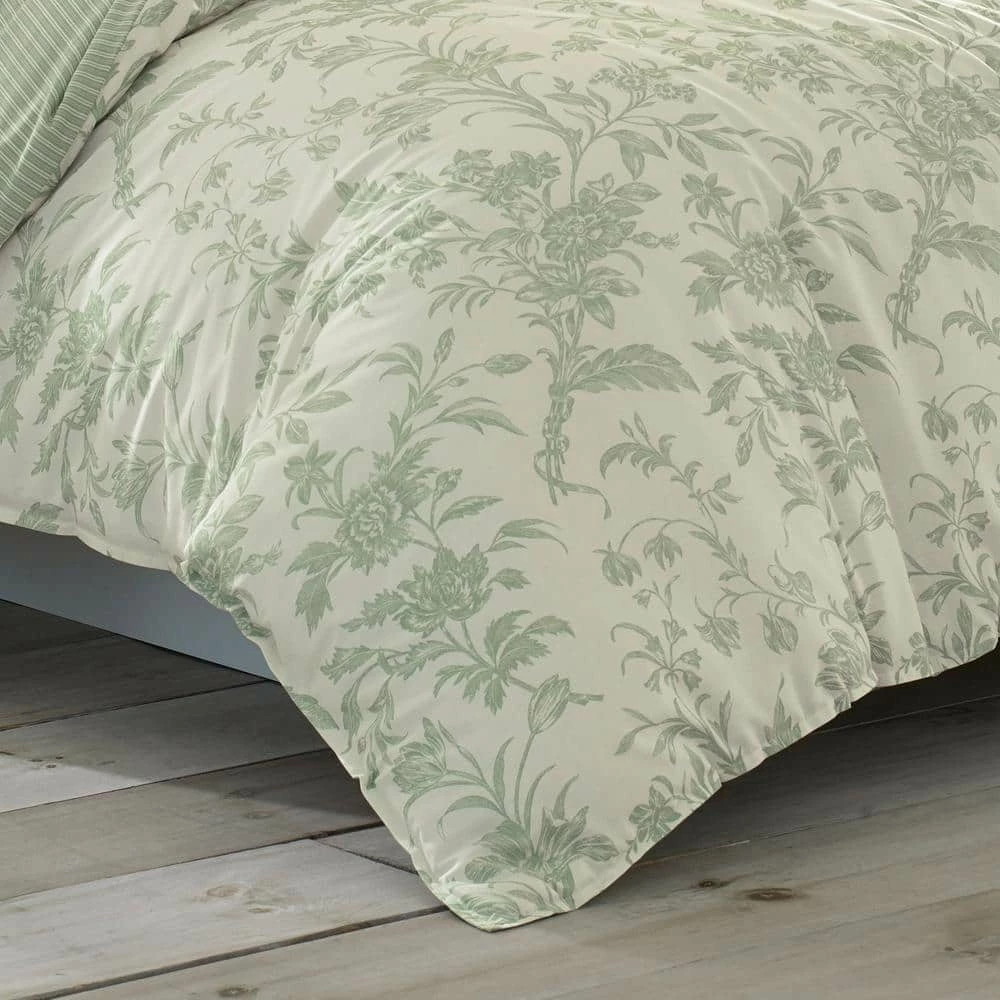 Sage green is a serene, beautiful color and it brings a lovely tranquility to this classic floral toile on ivory cotton ground. Coordinated with a crisp shirting stripe on the duvet reverse, European shams and square pillow, this timeless classic fits easily into a modern bedroom. A floral embroidered accent pillow repeats the comforter design and lends a unique, customized detail to the ensemble. Duvet cover features button and tie closure. Machine washable for easy care.