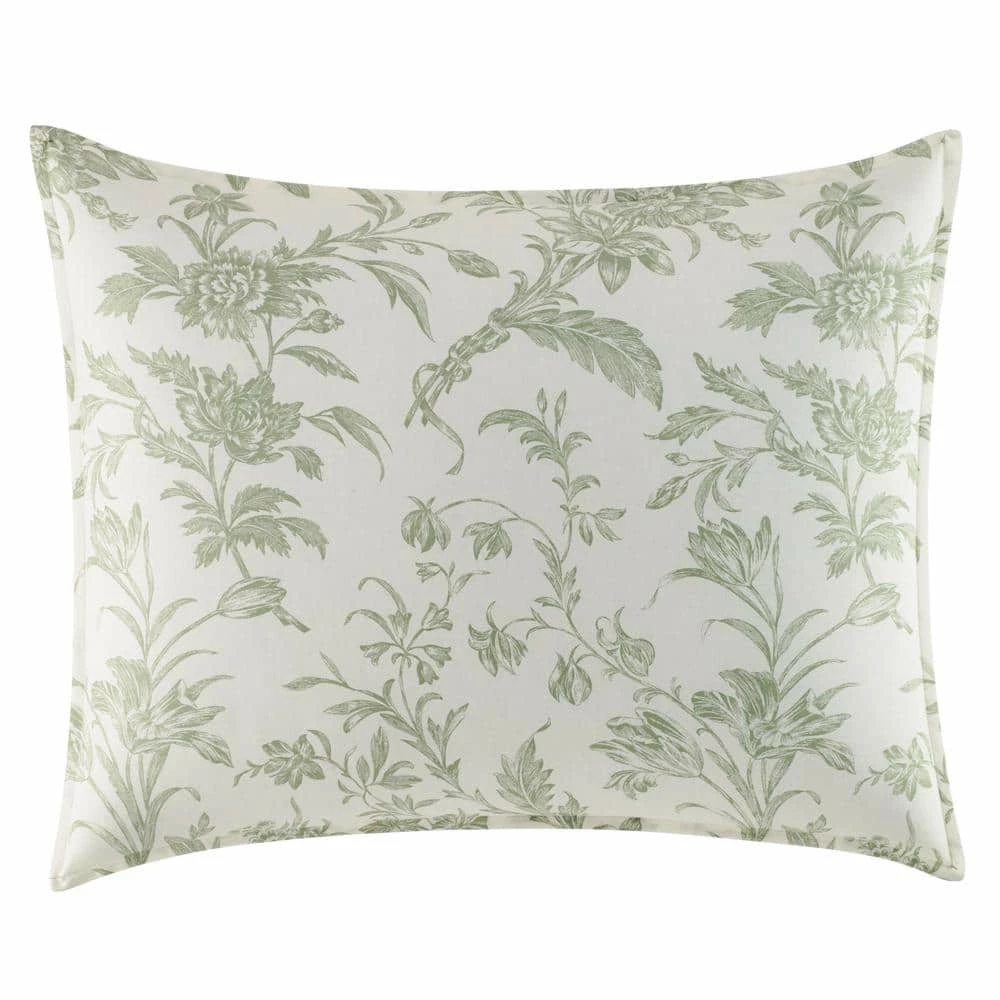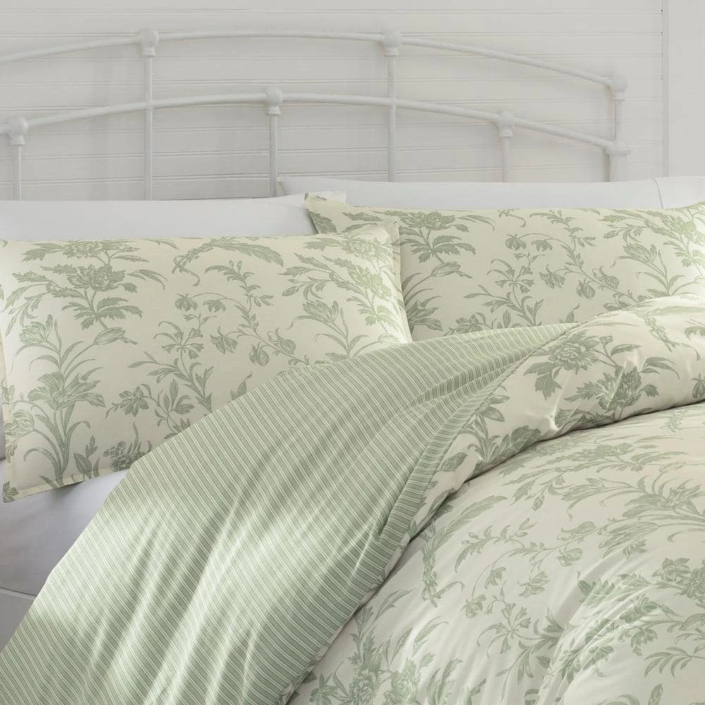 - Duvet and sham face are a timeless sage green floral toile printed on ivory ground; duvet and sham reverse, Euro sham and square pillow are sage and ivory stripe