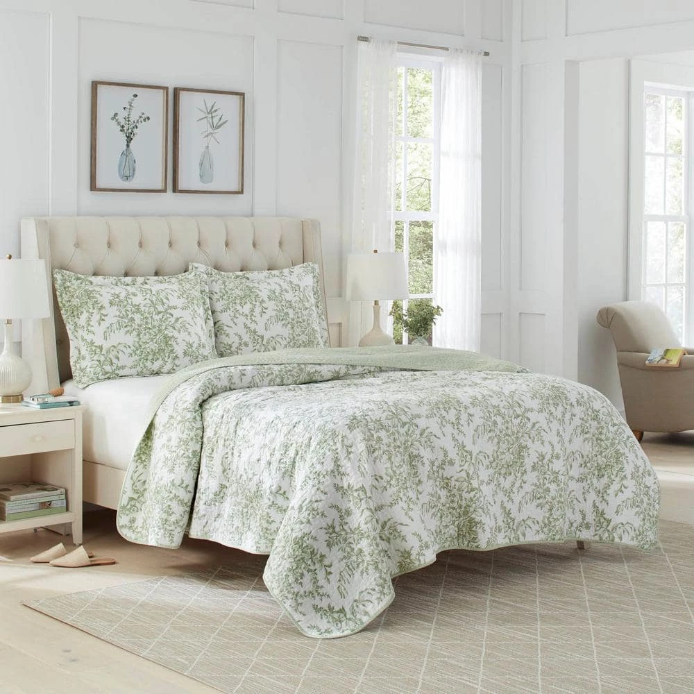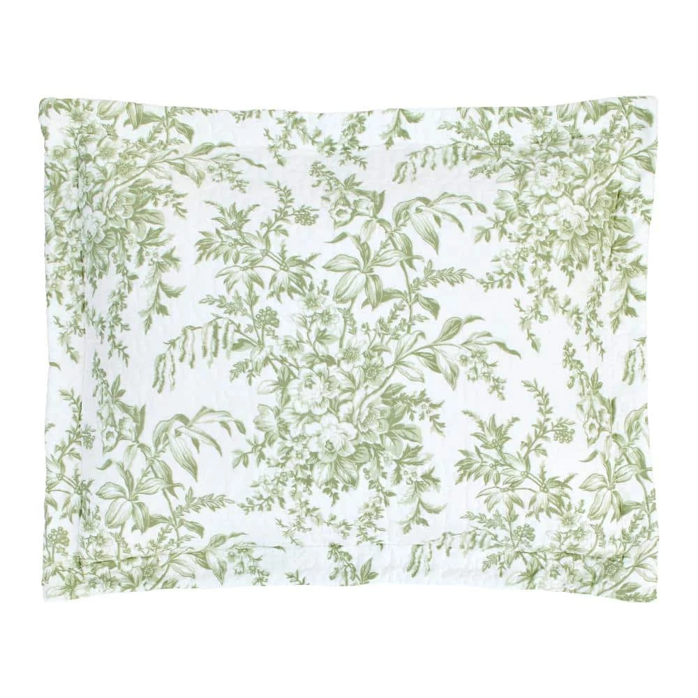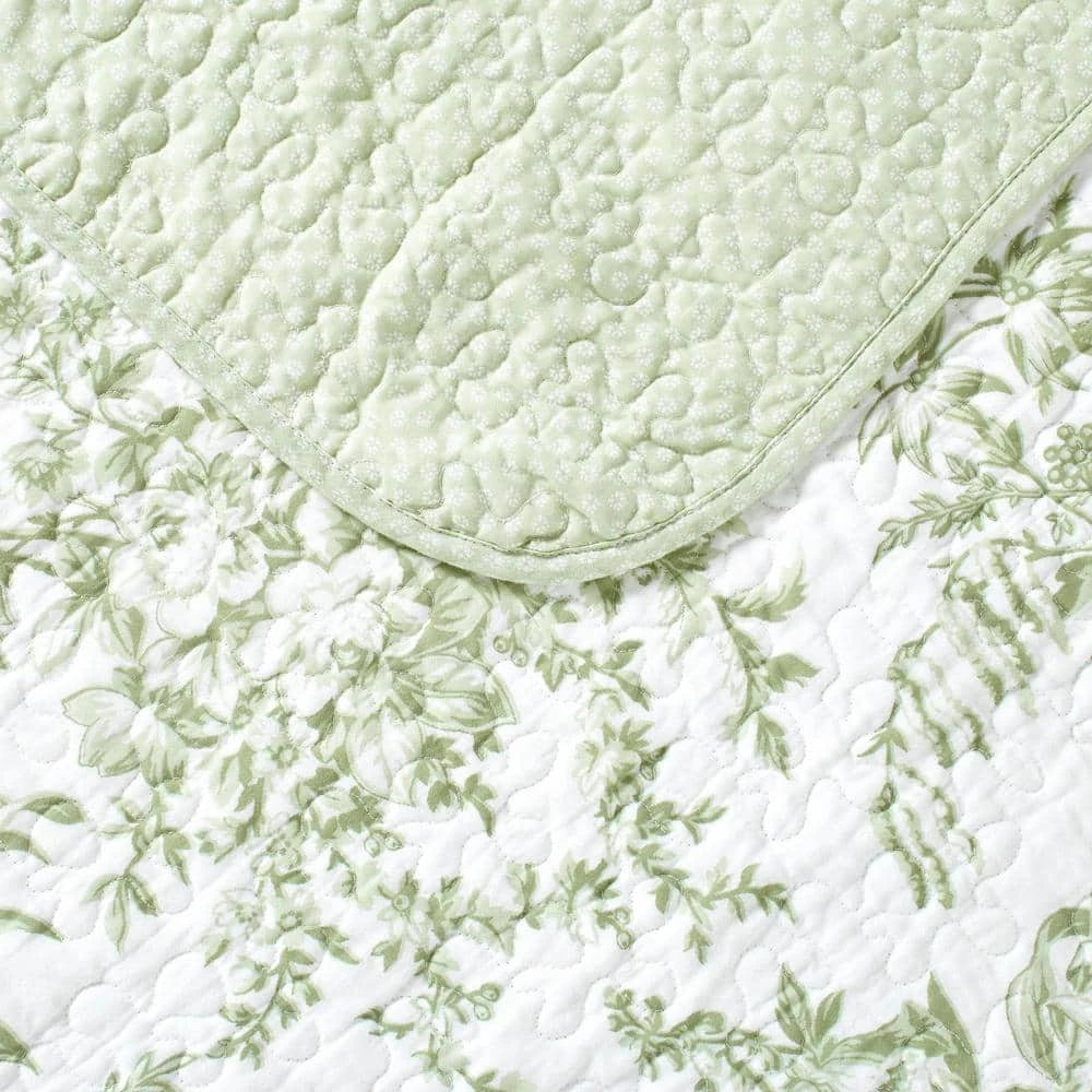 Green and white toile has timeless appeal in the bedford quilt design. This classic floral gets a fresh update when paired with a small geometric print in delft medium blue and white. 100% cotton pre washed for softness, it becomes cozier with every wash. Filled with a blend of 80% cotton/20% poly this quilt is light weight yet can be layered for year round use. Set includes 1 quilt and 2 shams for full/queen and king size, 1 sham for twin size. Machine washable for easy care.