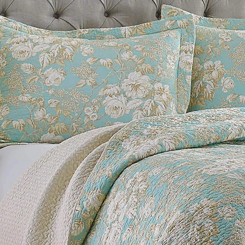 Antique white roses are highlighted against a rich aqua ground in the brompton classic quilt set. A beige and white mini geometric print on the reverse echoes the neutral leaves and accents in the floral print. 100% cotton pre-washed for softness, and becomes cozier with every wash. Filled with a blend of 80% cotton/20% poly this quilt is light weight yet can be layered for year-round use. Set includes one quilt and two shams for full/queen and king size, one sham for twin size. Machine washable for easy care.