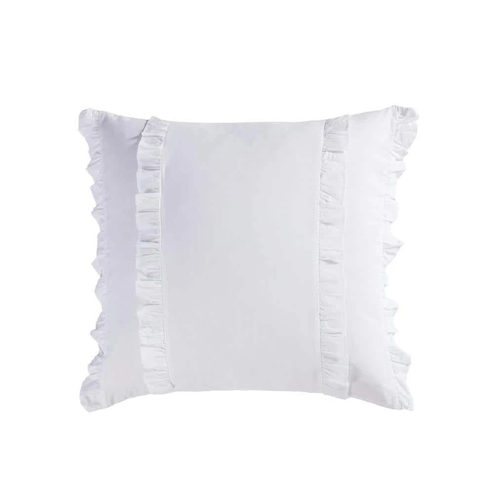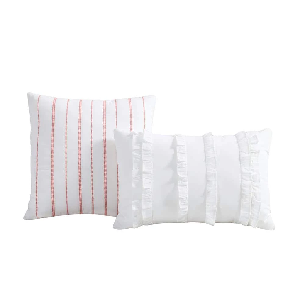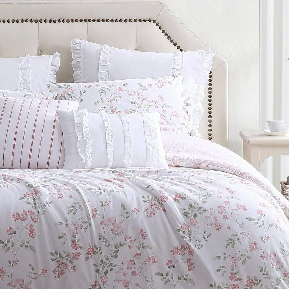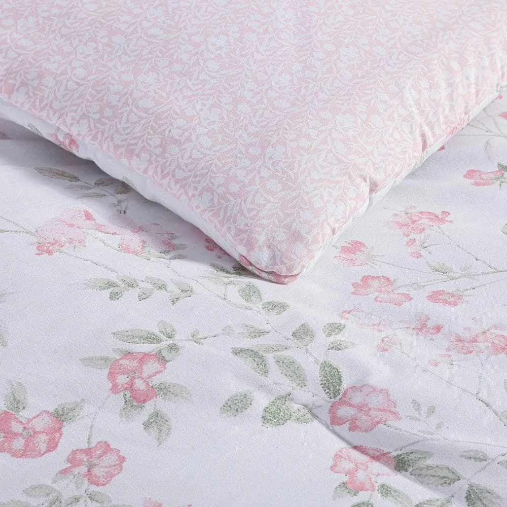 - Comforter and shams feature a delicate floral pattern design in blush pink and green on white, reverses to a pink and white ditsy floral print, euro sham and breakfast pillow are white with ruffles, square pillow is white with coral embroidered stripes