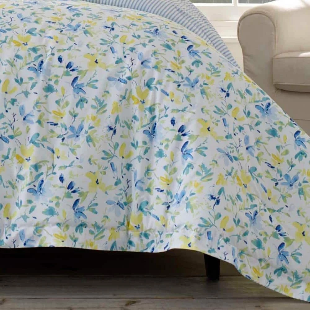 No matter the season, you can always wake up to Spring with this carefree watercolor floral bedding set. A garden fresh palette of cornflower blues and sunny yellow on a crisp white cotton ground reverses to a classic blue and white ticking stripe that also appears on the European shams and a coordinating shirred accent pillow. An additional accent pillow made of white cotton eyelet embroidery adds a signature heirloom touch to this updated cottage style. This all cotton comforter features a polyester fill and the included shams feature an overlap closure. Ensemble is machine washable for easy care. Twin comforter bonus set includes: one comforter (86″L x 63″W), one sham (21″L x 27″W), one Euro sham (26″L x 26″W), one throw pillow (18″L x 18″W) and one throw pillow (12″L x 20″W). Full/Queen comforter bonus set includes: one comforter (92″L x 88″W), two shams (21″L x 27″W), two Euro shams (26″L x 26″W), one throw pillow (18″L x 18″W) and one throw pillow (12″L x 20″W). King comforter bonus set includes: one comforter (92″L x 106″W), two shams (21″L x 37″W), two Euro shams (26″L x 26″W), one throw pillow (18″L x 18″W) and one throw pillow (12″L x 20″W).
