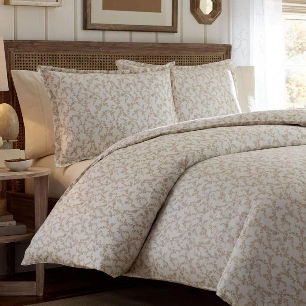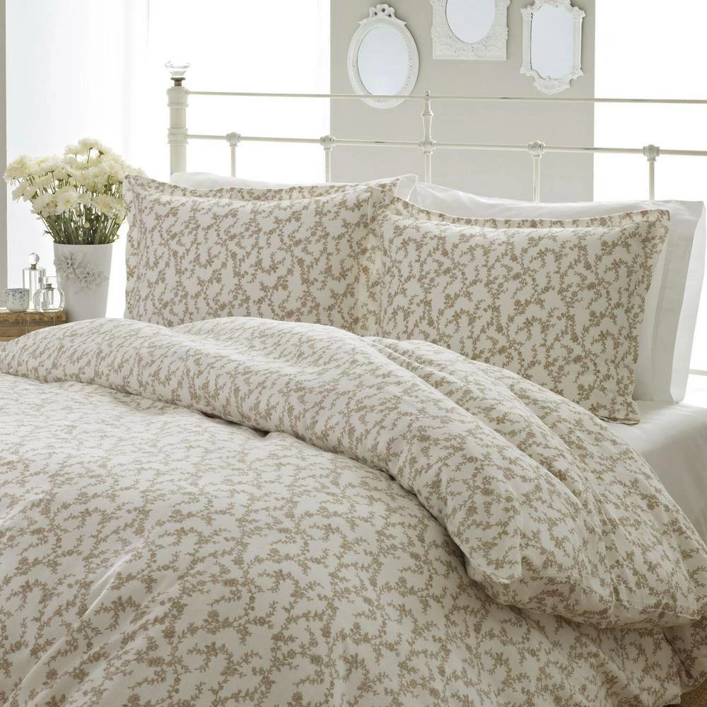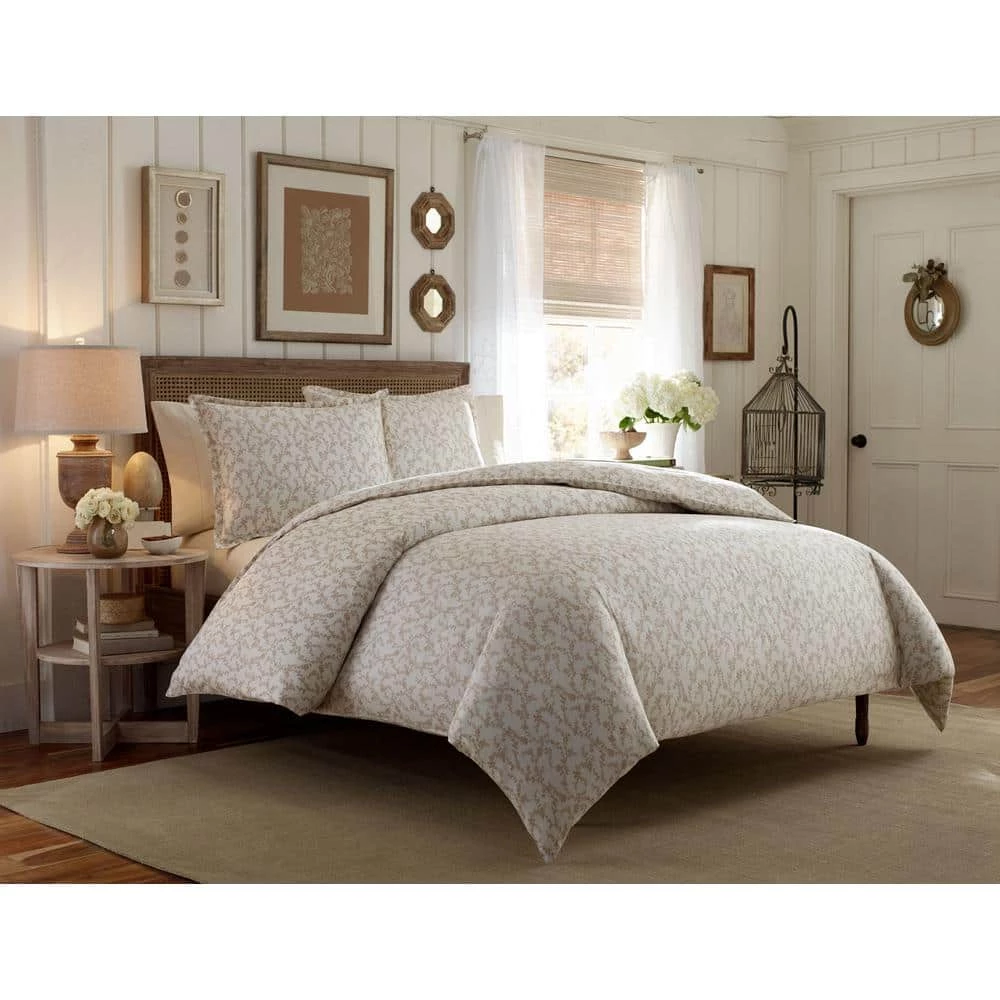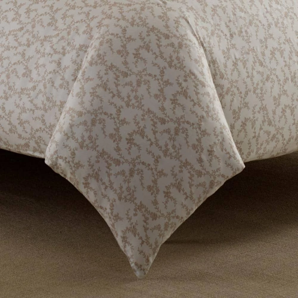Romantic yet modern, Victoria by Laura Ashley is a delicate floral toile printed on luxurious all cotton sateen. Indulge yourself. Its tailored simplicity and neutral taupe and cream palette give it a fresh modern look that is perfect for any bedroom. Twin Duvet Cover Set includes: One twin duvet cover (86 in. L x 66 in. W) and 1-standard sham (20 in. L x 26 in. W), Full/Queen Duvet Cover Set includes: 1-full/queen duvet cover (88 in. L x 88 in. W) and 2-standard shams (20 in. L x 26 in. W), King Duvet Cover Set includes: One king duvet cover (88 in. L x 104 in. W) and 2-king shams (20 in. L x 36 in. W).