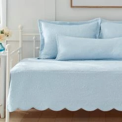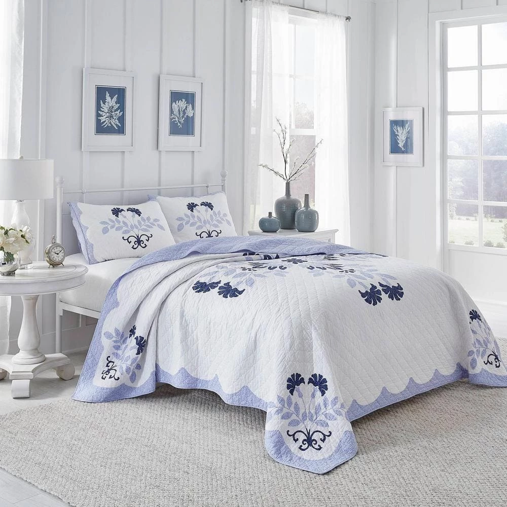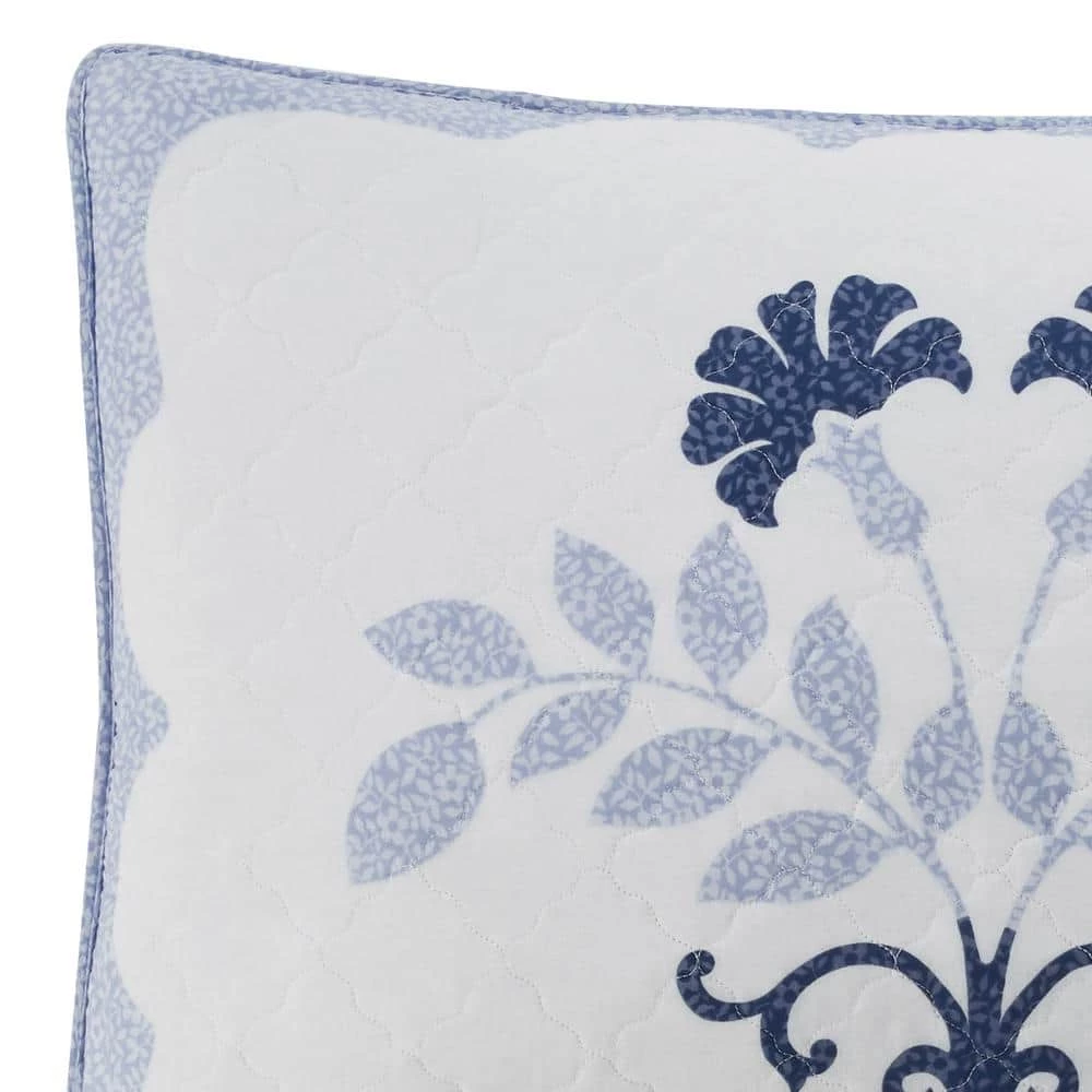 - Laura Ashley Rosaleen quilt and shams combine ranquilt tones of soft blue and deep indigo on a crisp white ground, reverse print is soft blue and white