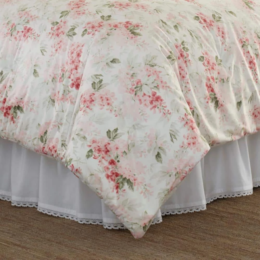 Cuddle up with the coziness of a classic Laura Ashley floral printed on a faux velour material. The lounge worthy bedding features pops of beautiful pinks and greens on a sharp white ground. The soft snug face features a cotton reverse and polyester fill. Machine washable for easy care.