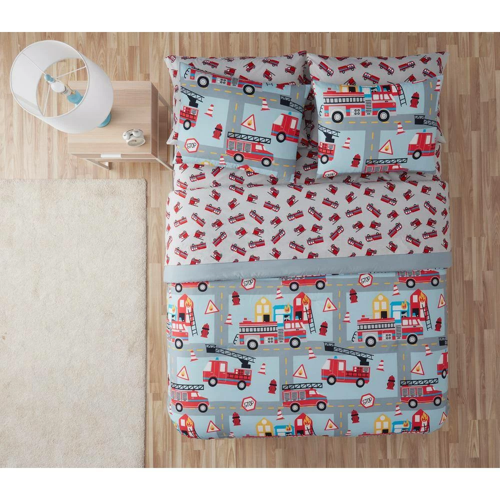Beep beep. Here come the Fire Trucks with their loud sirens and bright lights. This kute kids Fire Truck Road Comforter and Sheet Set is the perfect addition for your aspiring fire fighter and will have them dreaming of putting out fires all night long. Ultra-soft and durable, this set is also machine washable for added convenience. Sweet dreams.