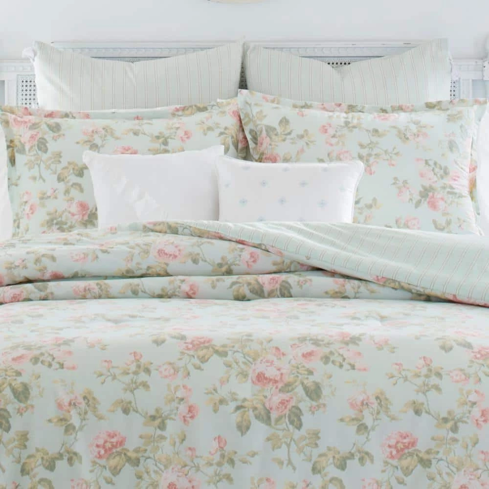 - This ensemble features a beautiful 100% cotton antique rose pattern from the Laura Ashley archive. Sweet pink floral motifs pop on a soft seafoam green ground. The ticking stripe reverse is added for a layered pattern interest. The ticking stripe is pulle