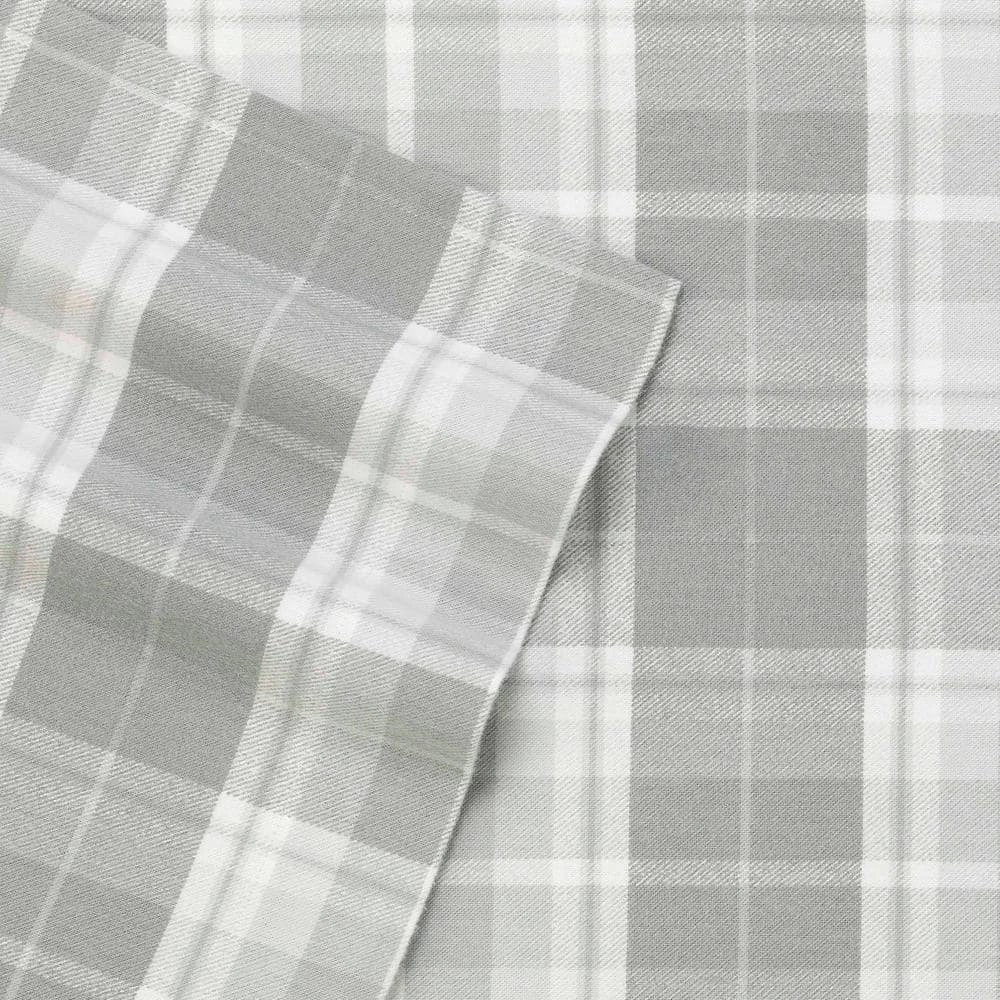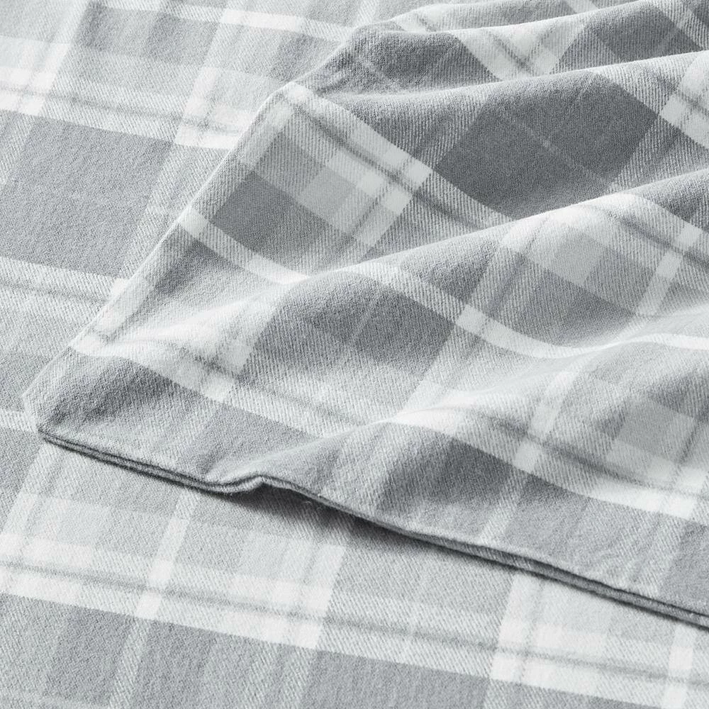 - The Laura Ashley Mulholland Plaid Flannel Sheet Set features a medium grey and white plaid design