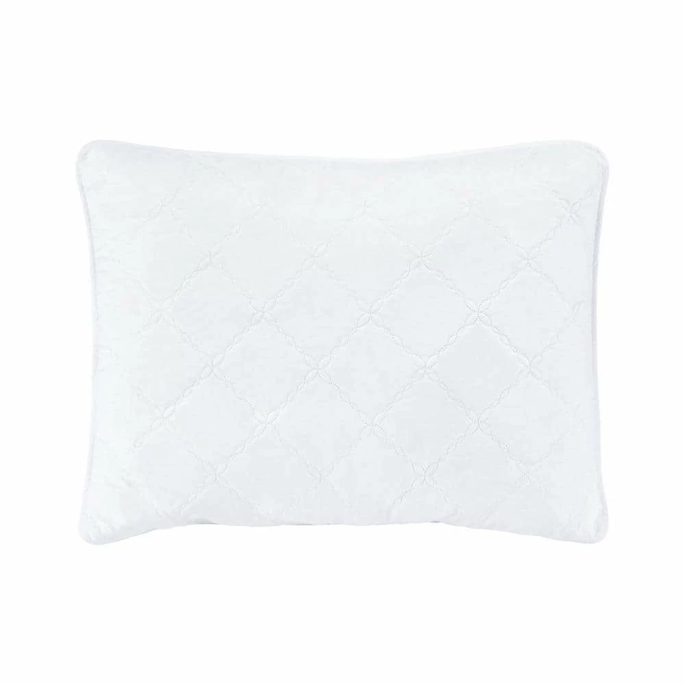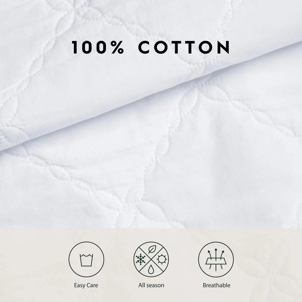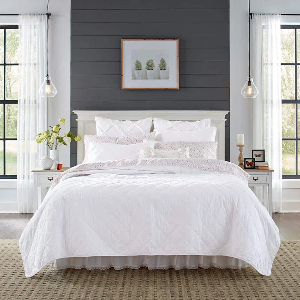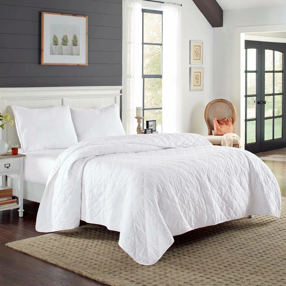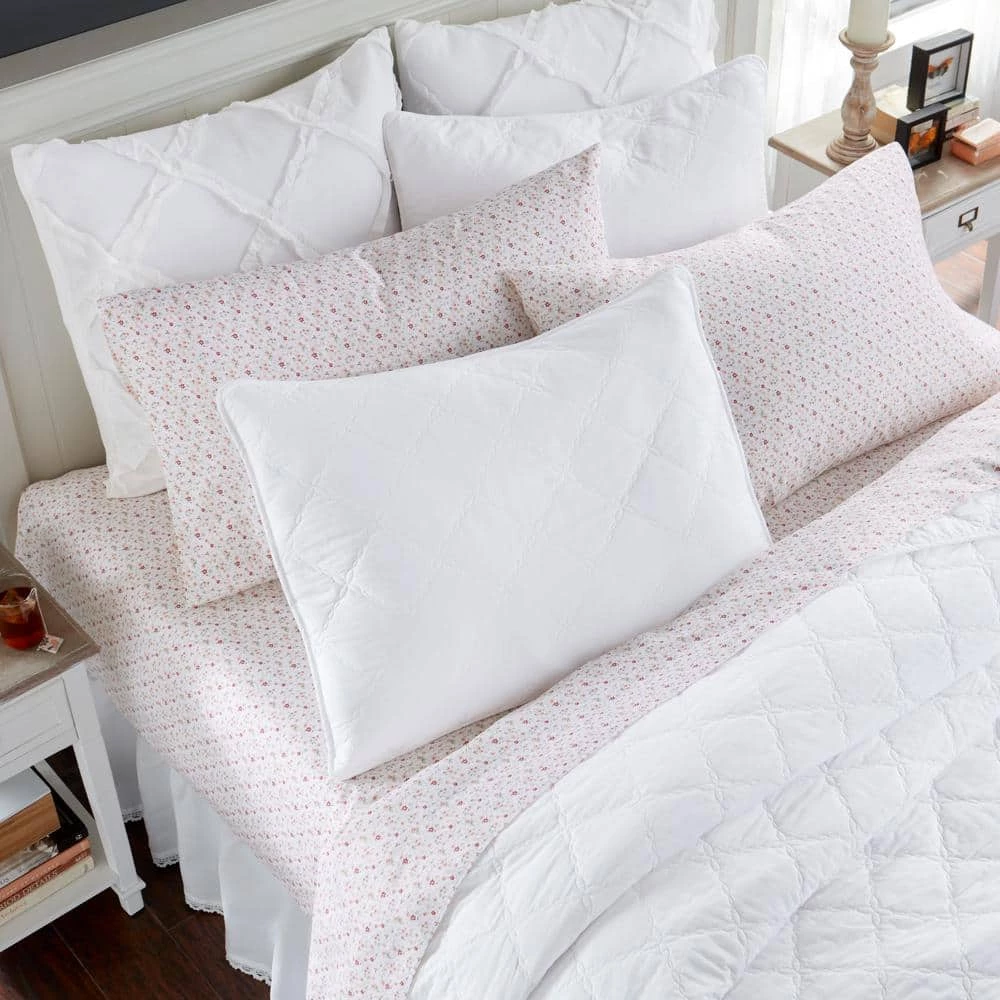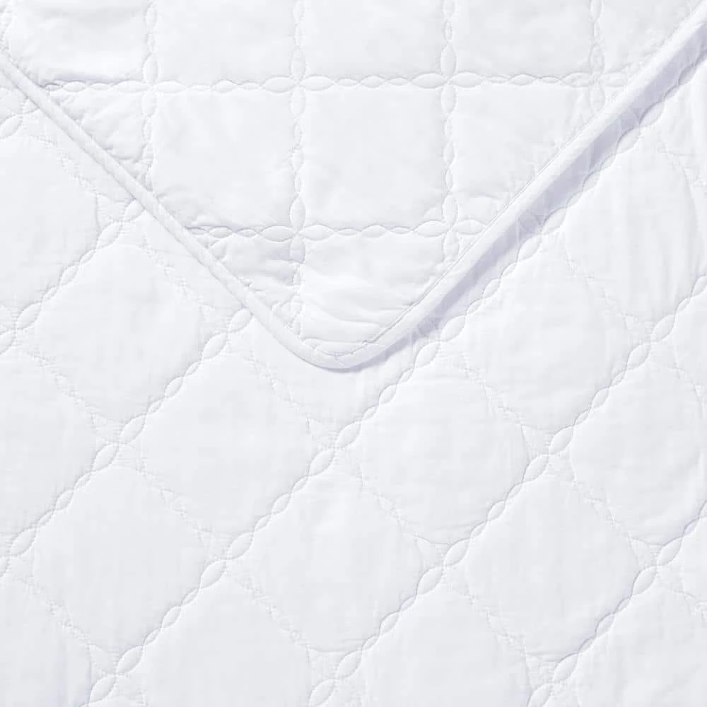 This romantic white cotton quilt ensemble exudes comfort, Calm, and luxury. Quilted in a beautifully detailed floral scrollwork design, the quilt, shams, and decorative accent pillows are all edged in cotton crocheted lace with a ruffled gather at the corners. The all cotton comforter is pre washed for additional softness. Traditional in inspiration and modern in spirit, this pristine quilt set will fit easily into any lifestyle.