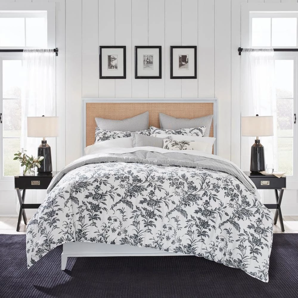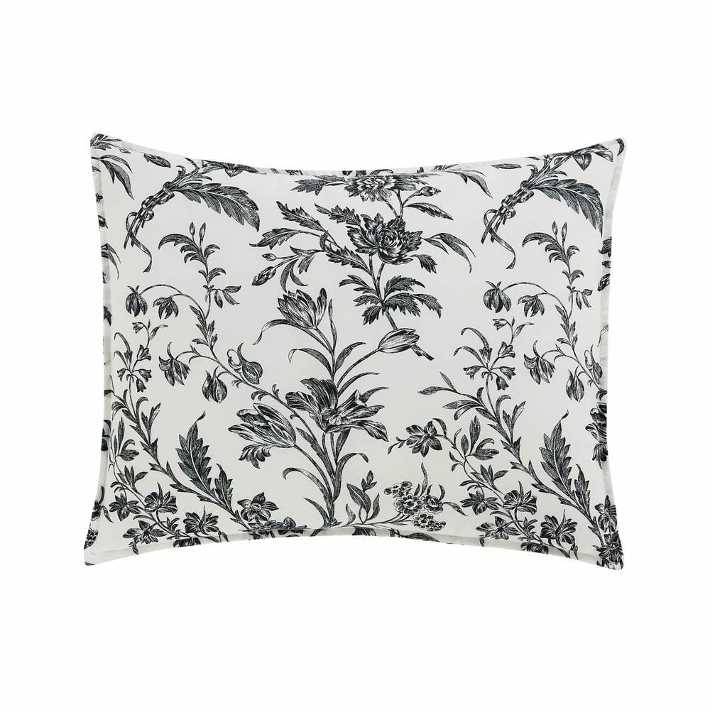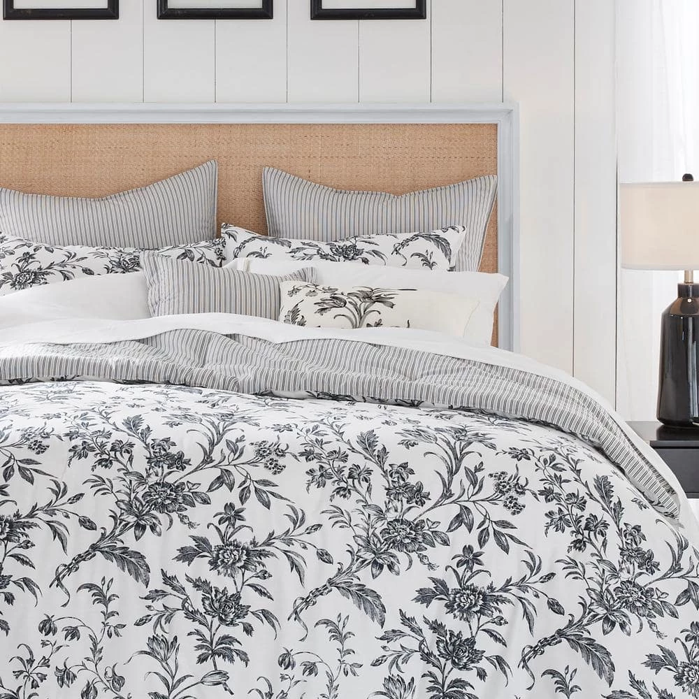 - Comforter and shams feature a delicate floral toile pattern in black and white, reverses to a classic black and white stripe, euro sham and square pillow are black and white stripe, breakfast pillow is white with black floral embroidery