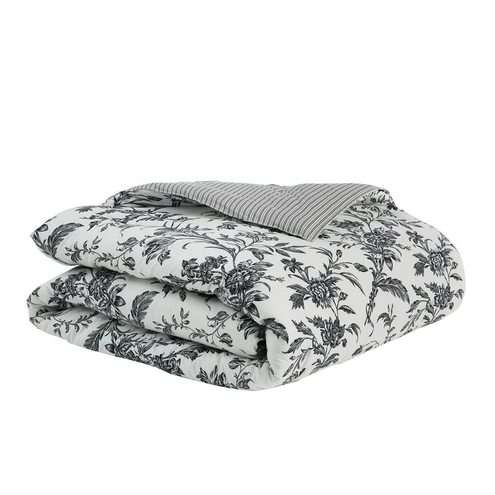 Floral toile designs have timeless appeal and Amberley is a classic in black and soft white. The 100% cotton comforter reverses to a classic black and white ticking stripe, which is repeated on the European shams and square decorative pillow. Breakfast pillow has elegant black embroidery on a white ground. comforter and pillows are filled with 100% poly. comforter is medium weight for year-round use. Set contains one comforter and two standard or king shams (one sham for twin size), two European shams and two decorative pillows. Comforter and shams are machine washable for easy care