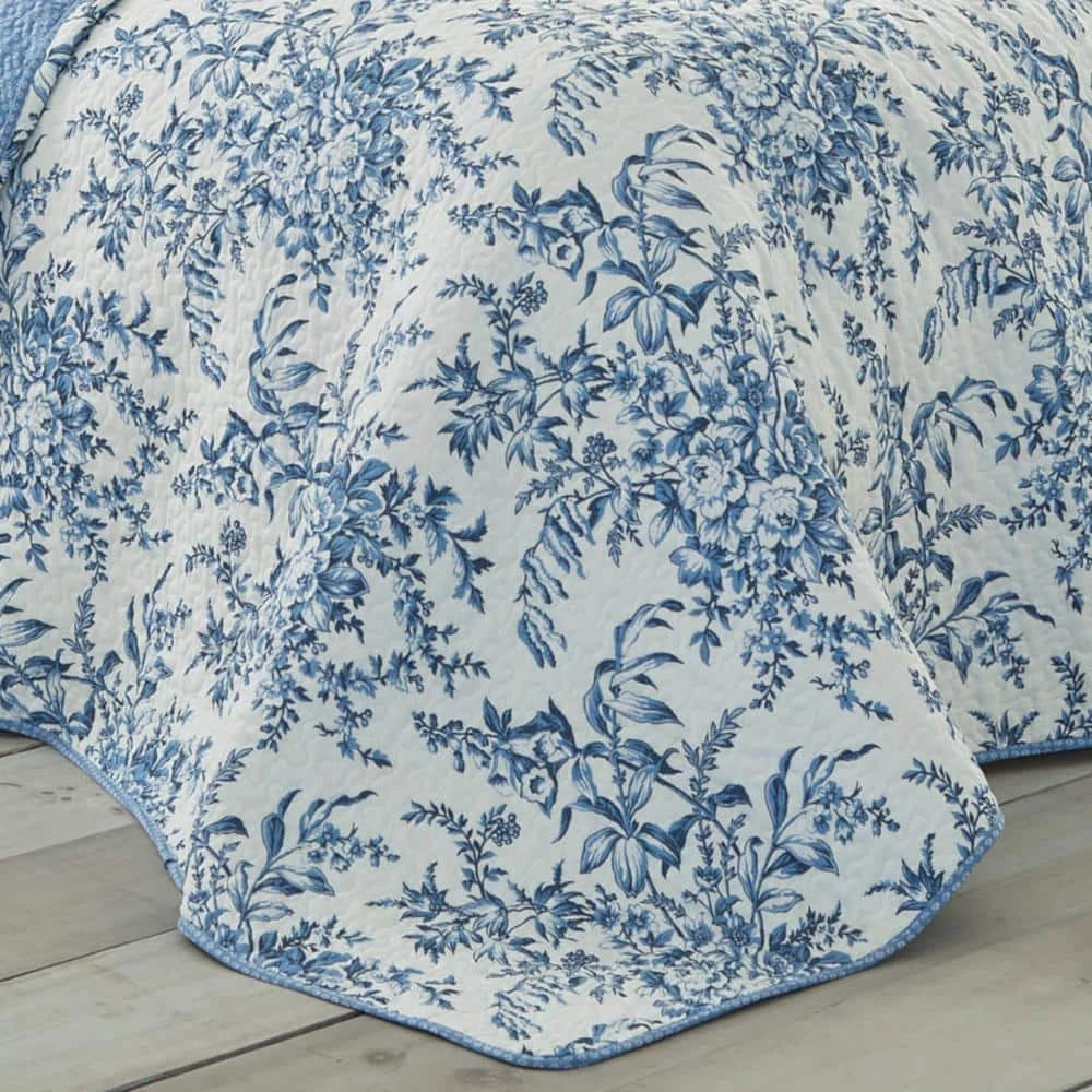 Blue and white toile has timeless appeal in the Bedford quilt design. This classic floral gets a fresh update when paired with a small geometric print in delft medium blue and white. 100% cotton pre-washed for softness, it becomes cozier with every wash. Filled with a blend of 80% cotton/20% poly this quilt is light weight yet can be layered for year-round use. Set includes one quilt and two shams for full/queen and king size, one sham for twin size. Machine washable for easy care.