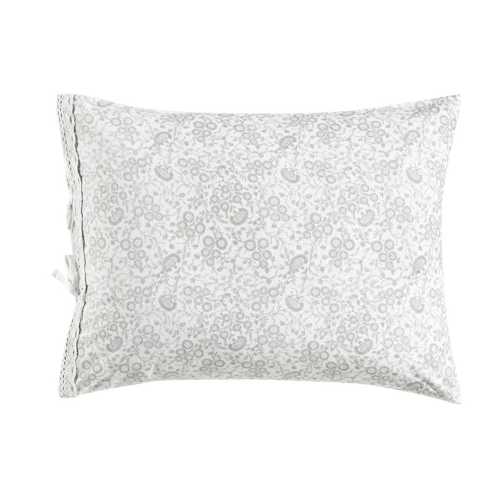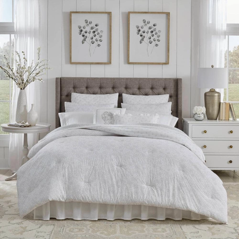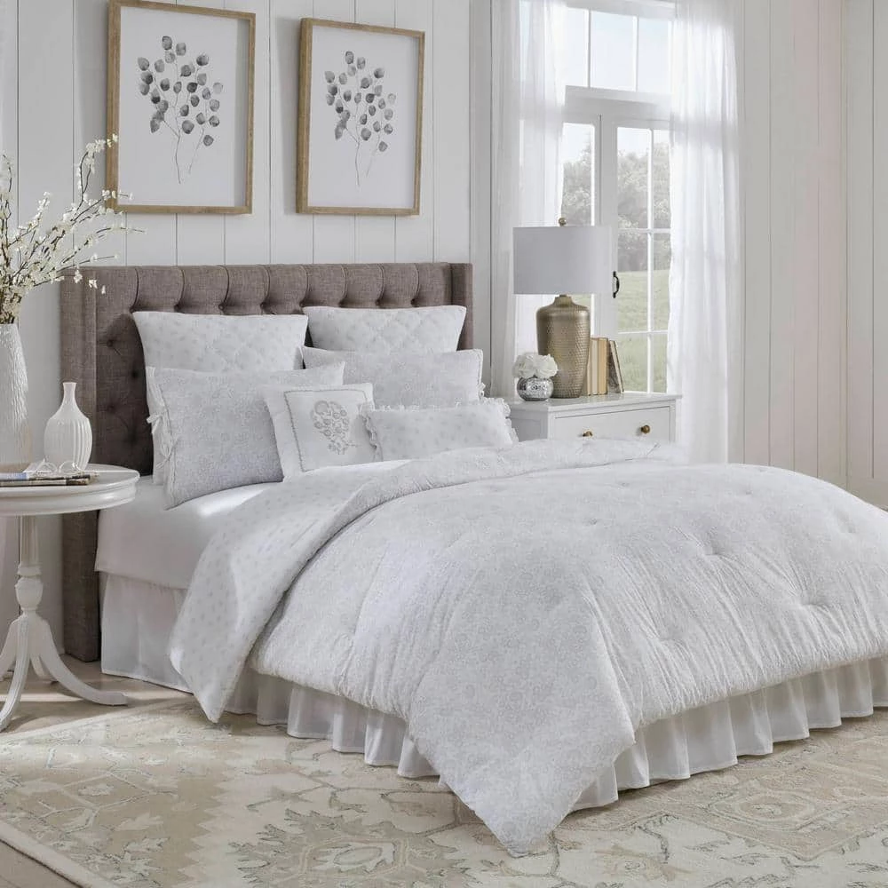 Antique lace is the inspiration behind the airy cerie comforter and sham bonus set, which includes all the pieces for a total bed makeover. 100% cotton comforter in white with pale grey printed lace design reverses to white with scattered grey sprigs. standard and king shams have lace trim closures with bow ties. a quilted chain stitch adds a feminine touch to the European shams. breakfast pillow is edged in a ruffle, and square pillow has beautiful grey embroidery. comforter and pillows are filled with 100% poly. comforter is medium weight for year-round use. Set contains one comforter and two standard or king shams (one sham for twin size), two European shams and two decorative pillows. Comforter and shams are machine washable for easy care. spot clean pillows.