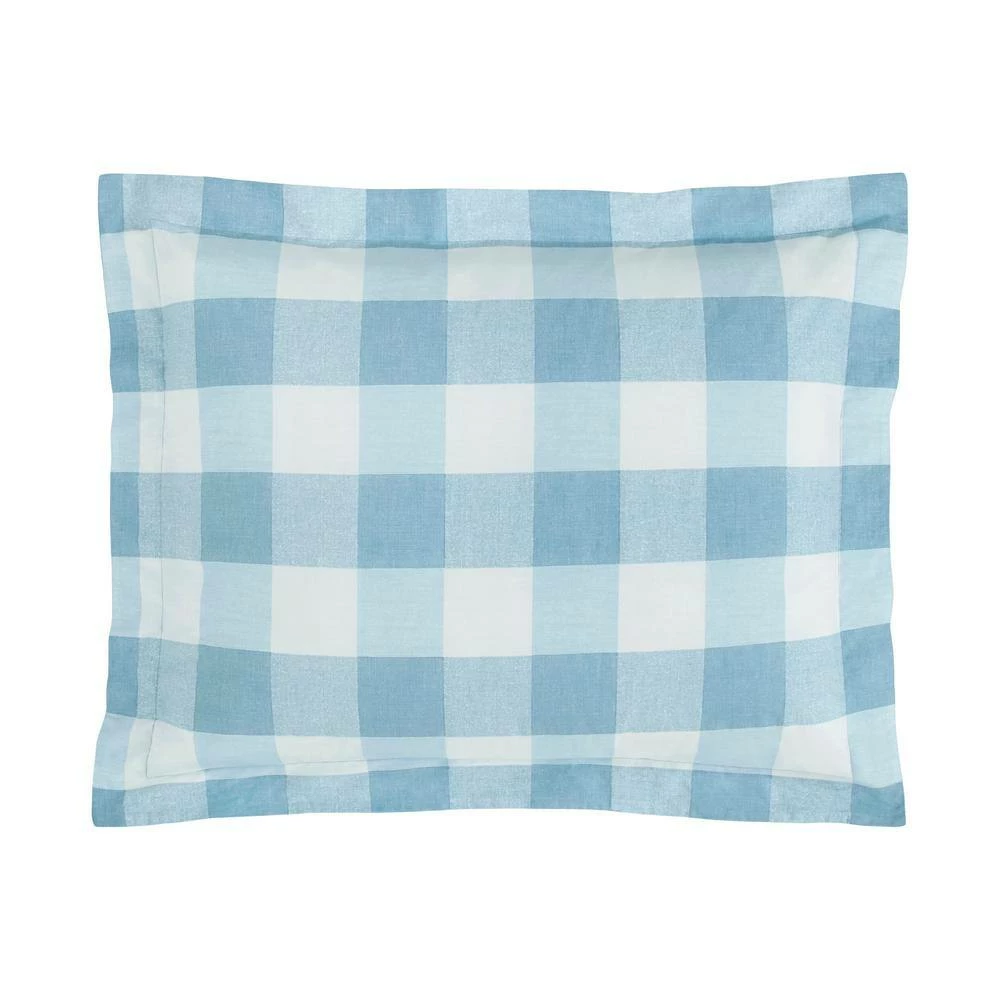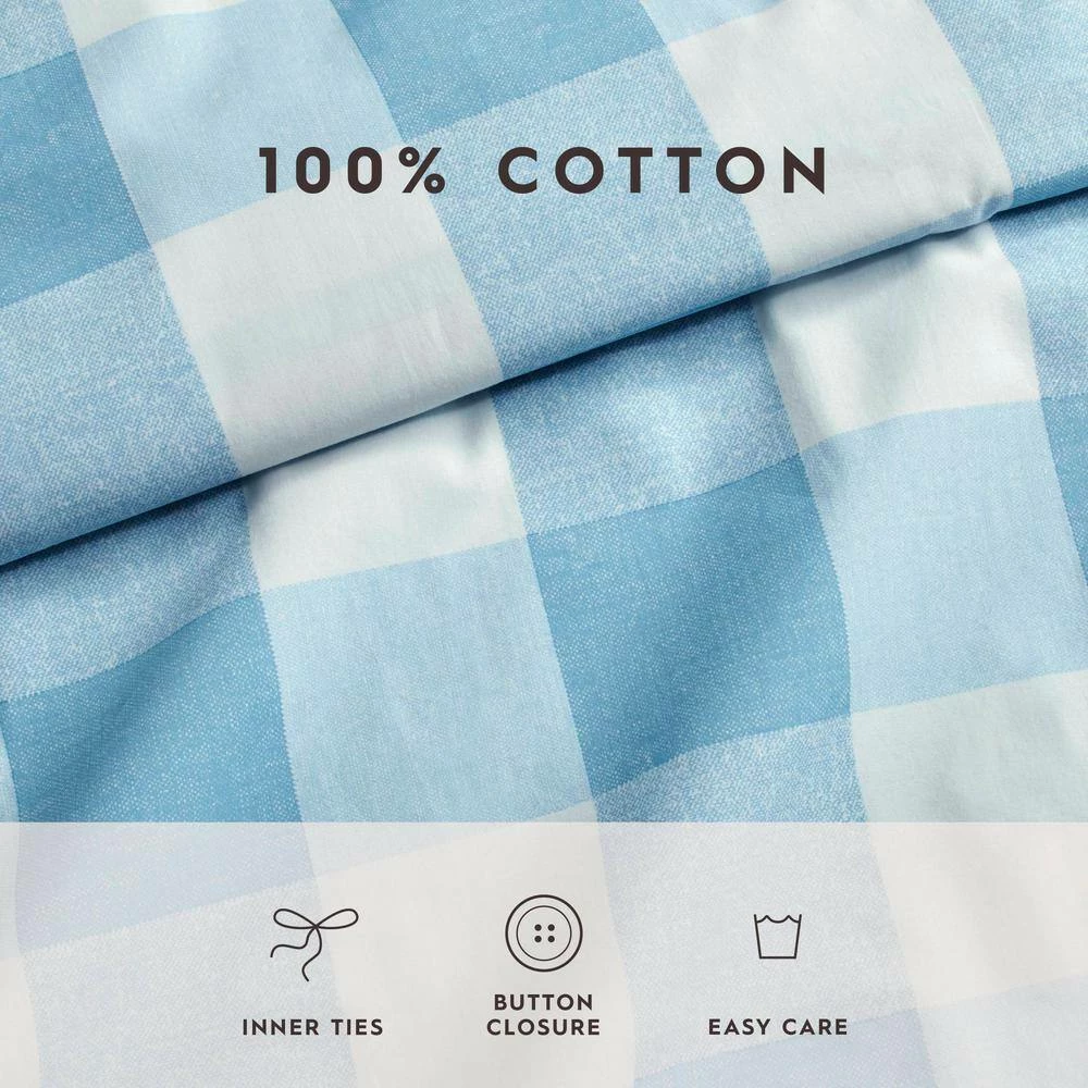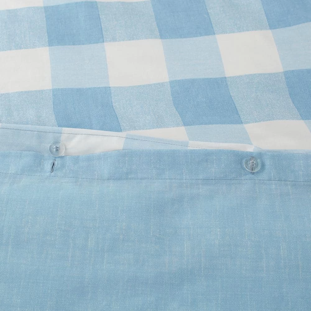 - Duvet cover and shams are light blue and white large scale gingham check, reversing to a blue printed texture