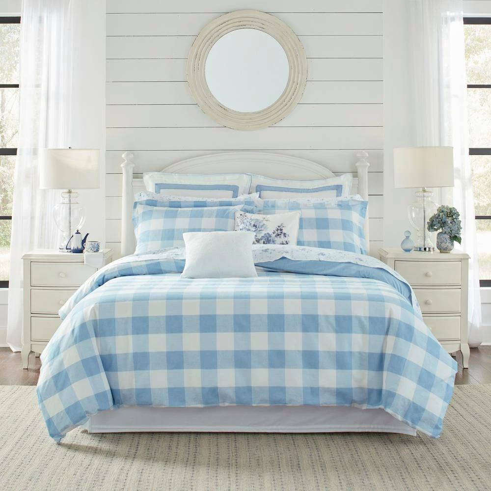Laura Ashley Cynthia duvet cover and shams add timeless style to your bedroom in a charming blue and white gingham check. reverse fabric is a light blue printed texture. Standard and king shams have end cap closures. Made of 100% cotton plain weave. Set contains one duvet cover and two standard or king shams (one sham for twin size). Duvet cover includes corner ties to keep your insert in place. Machine washable for easy care.