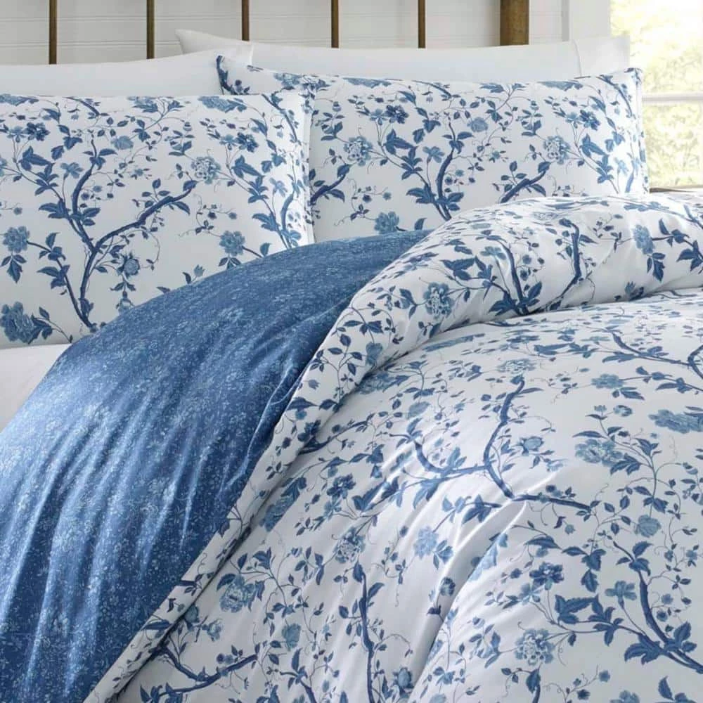 Blue and white porcelain has inspired beautiful floral textiles throughout history and its timeless appeal always looks fresh and in style. This striking floral vine pattern on a crisp white cotton ground is highlighted by a dramatic, deep blue floral mini print on the duvet cover reverse. This beautiful bedding set is 100 Percent cotton and machine washable for easy care. Duvet cover features button closure with inner ties. Duvet cover included in the set, the duvet insert is not included. Twin comforter set includes: 86 in. L x 63 in. W comforter and one 21 in. L x 27 in. W sham. Full/Queen comforter set includes: 92 in. L x 88 in. W comforter and two 21 in. L x 27 in. W shams. King comforter set includes: 92 in. L x 106 in. W comforter and two 21 in. L x 37 in. W shams. Polyester fill Included shams feature an easy overlap closure.