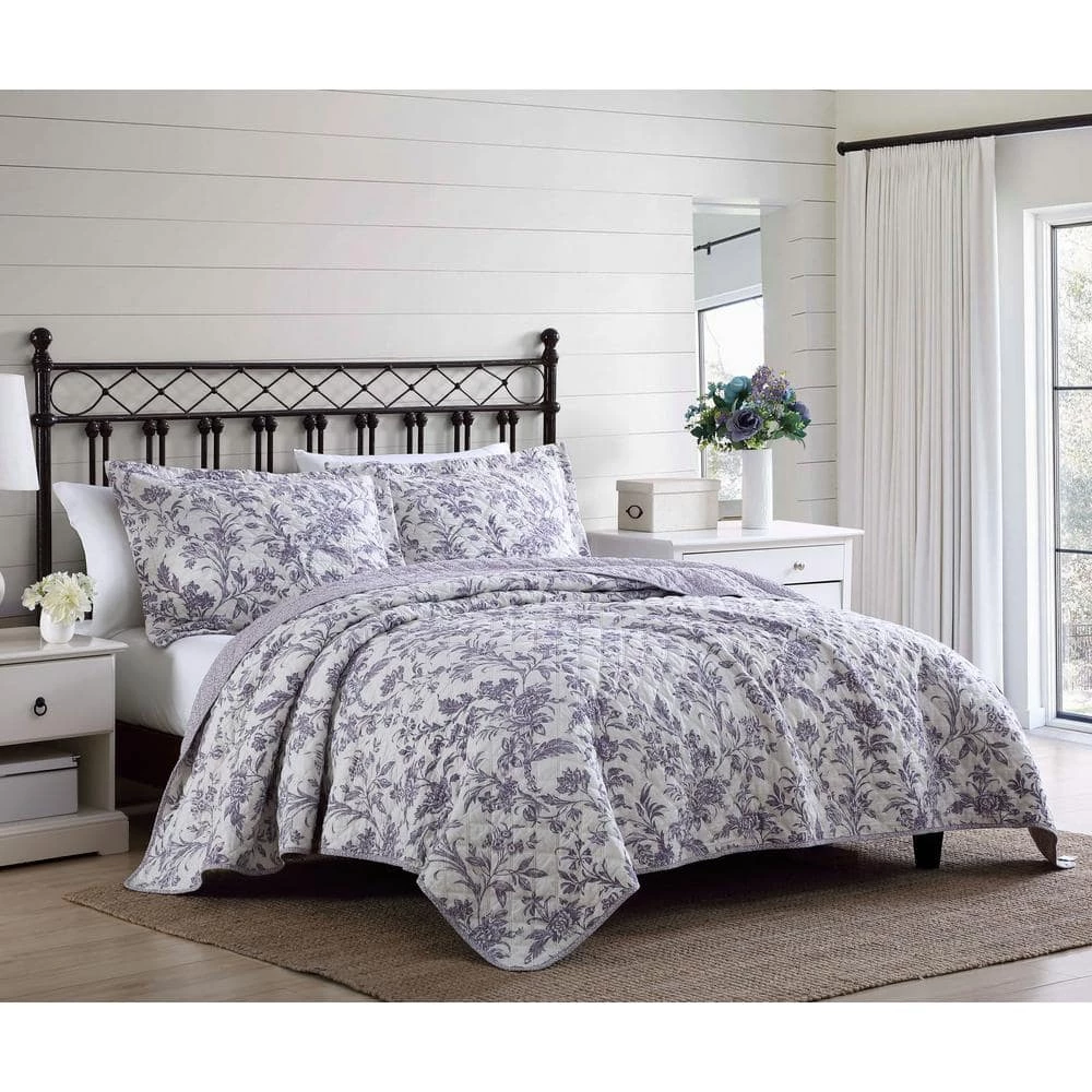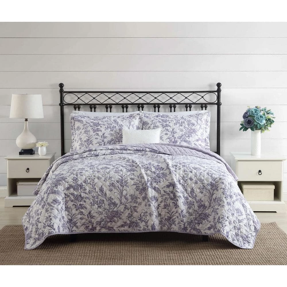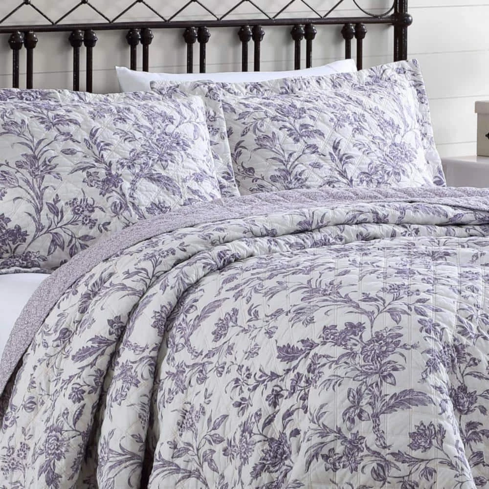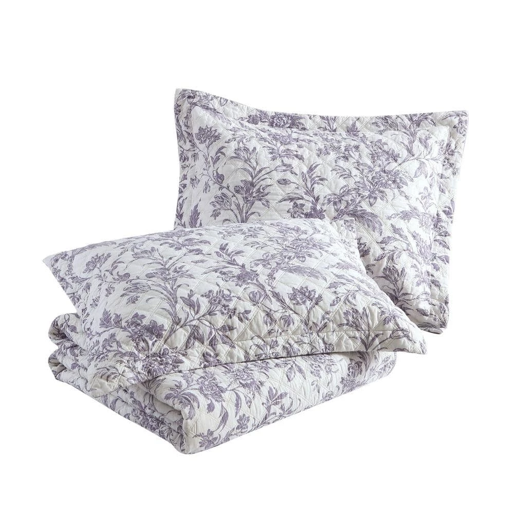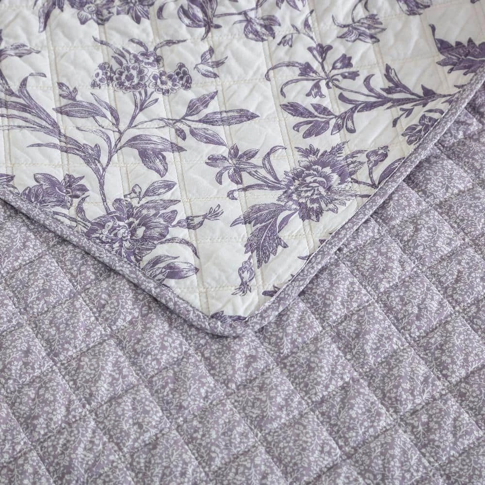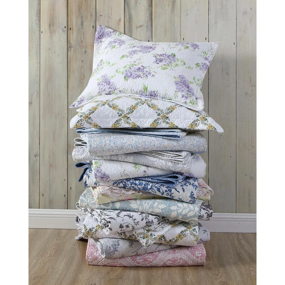 Update your bedroom decor with the Delila Quilt Set from Laura Ashley. The quilt and coordinating shams feature a gorgeous plum floral design printed over the white ground, while the quilt reverse features a delicate white floral vine print on a light plum ground. Constructed with soft and breathable cotton, this quilt ensemble is a perfect layering piece for your current bedding set or can be used on its own in the warmer months. This quilt set is prewashed for added softness and machine washable for easy care. Quilt features a cotton/polyester blended fill. Twin quilt set includes: one quilt (88″L x 68″W) and one standard sham (21″L x 27″W). Full/Queen quilt set includes: one quilt (90″L x 90″W) and two standard shams (21″L x 27″W). King quilt set includes: one quilt (96″L x 104″W) and two king shams (21″L x 37″W).